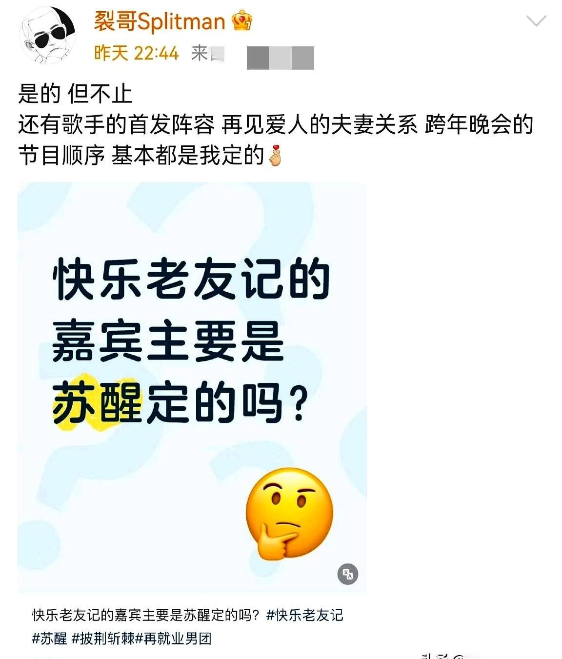 好家伙,我刚知道,原来芒果台现在是苏醒开的。 有人在网上特正经地问,《快乐老友记》的嘉宾是不是他定的。 结果他老人家直接小号开麦:“是啊,不止呢,歌手谁首发,跨年谁压轴,就连再见爱人谁跟谁掰了,都我说了算。” 真的,看到这回复我直接笑出声。 你跟他讲道理,他跟你装傻。你问他一个傻问题,他能用一个更傻的回答把你噎死。 这叫什么? 这叫降维打击。 他压根就没想跟你解释什么“艺人没有那么大权力”、“这是节目组的决定”这种正确的废话。 他选择直接跟你一起“发疯”。 你觉得我手眼通天?行,那我就把天给你捅破。 换成别的艺人,估计就是团队出来发个不痛不痒的声明,或者干脆冷处理。多没劲。 苏醒这人,你永远可以相信他的幽默感,内核其实是一种清醒到不行的松弛感。他太明白网友想看什么,也太明白怎么用四两拨千斤的方式,让自己从这种无聊的揣测里脱身了。 真的,内娱需要这种活人。 不然,多没意思啊。