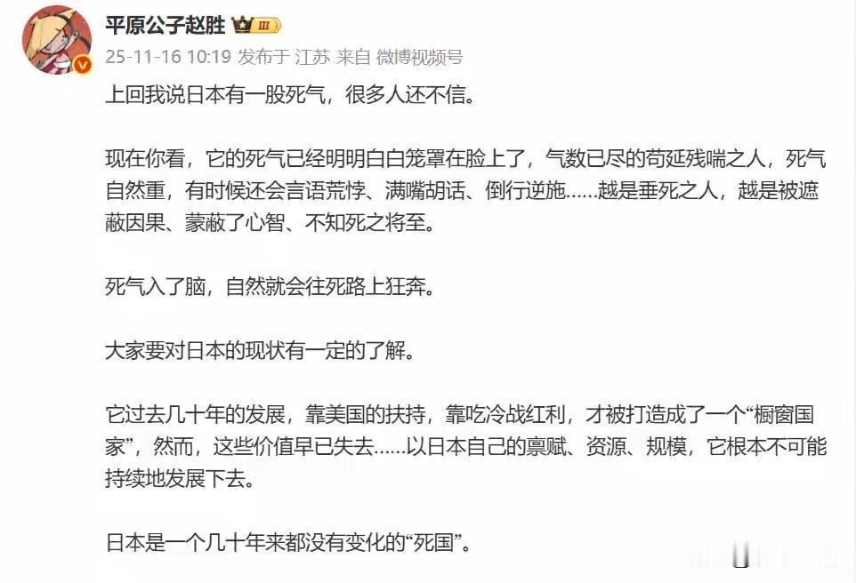 颠覆认知! 为什么?为什么一个中国博主赵胜,如此不留情面地痛批日本,这话非但没遭反驳,反倒让日本几百万网民集体共鸣——戳破的何止是表象,更是岛国无法逆转的宿命! 这“死气”藏在餐桌上:科技黄桃罐头算硬菜,炸鸡腿裹着淀粉肠,米饭只给一小口,美其名曰“精致”,实则是物资匮乏的遮羞布; 这“死气”露在基建里:电线乱如蛛网,满街K-car跑不过新能源浪潮,只因发动机产业拴着500万漕工饭碗,敢变就等于砸锅; 这“死气”更渗在骨子里:老年人霸占所有好岗位,年轻人看不到出路,“工匠精神”成了职场霸凌的幌子,人人都在当“不粘锅”推卸责任。 死气缠身的国家,最容易赌国运,这也是日本军国主义死灰复燃的根源——自身没了发展底气,就想靠挑衅中国转嫁危机。 但赵胜的话点透本质:“如果一个国家朝气蓬勃,有家底子有韧性,它是不会随随便便拿自己的国运去赌的。因为公平较量就能赢,根本没必要赌。” 中国的“朝气”看得见:新能源汽车驰骋全球,光伏技术领跑世界,基建狂魔不断刷新纪录;年轻人敢闯敢拼,创业创新活力迸发,从航天到芯片,处处是突破的身影。 我们不赌国运,只因“朝气蓬勃的国家,公平较量就能赢”;我们稳步崛起、筑牢国防、稳住经济,靠的是开放包容、创新驱动,靠的是14亿人拧成一股绳的凝聚力。