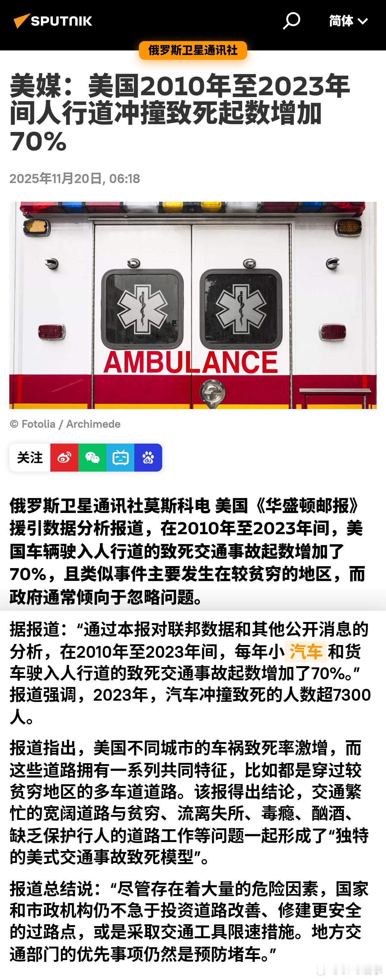 美媒:美国2010年至2023年间人行道冲撞致死起数增加70%