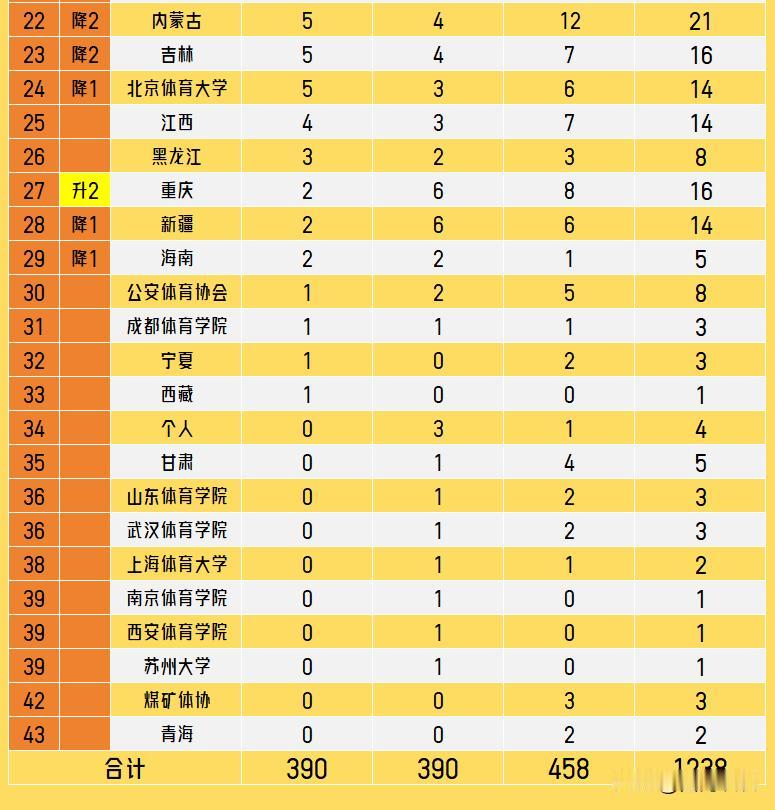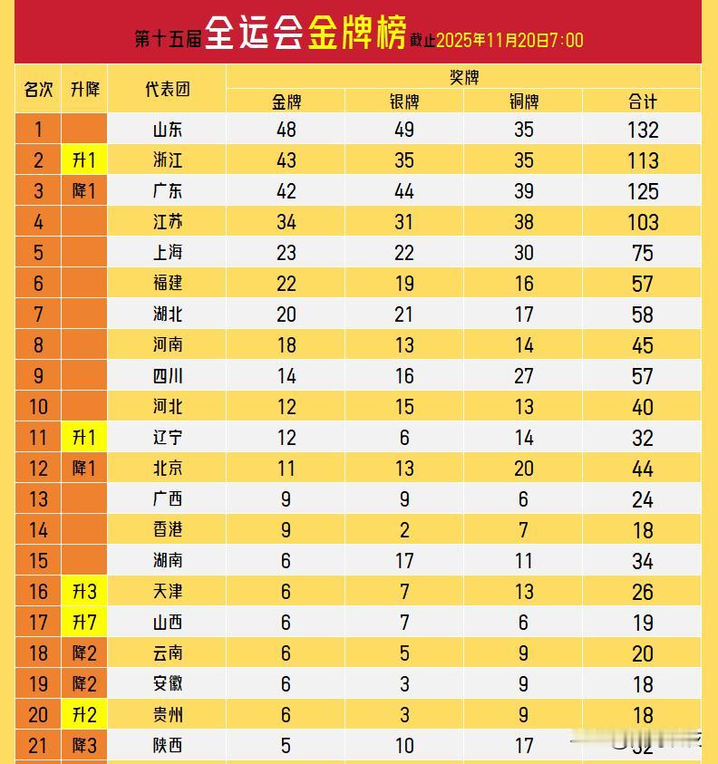 【山东继续领跑双榜!全运会已决出金牌总数升至390枚,鲁粤浙苏奖牌全过百!】 截止11月20日7时,本届全运会共产生384枚金牌、384枚银牌、458枚铜牌,共计1238枚奖牌。 山东以48金49银35铜领跑金牌榜、奖牌榜,浙江和广东分列金牌榜第二和奖牌榜第二。 辽宁、天津、山西、贵州各重庆排名各有上升,斩获5枚及以上金牌的团体升至24个。