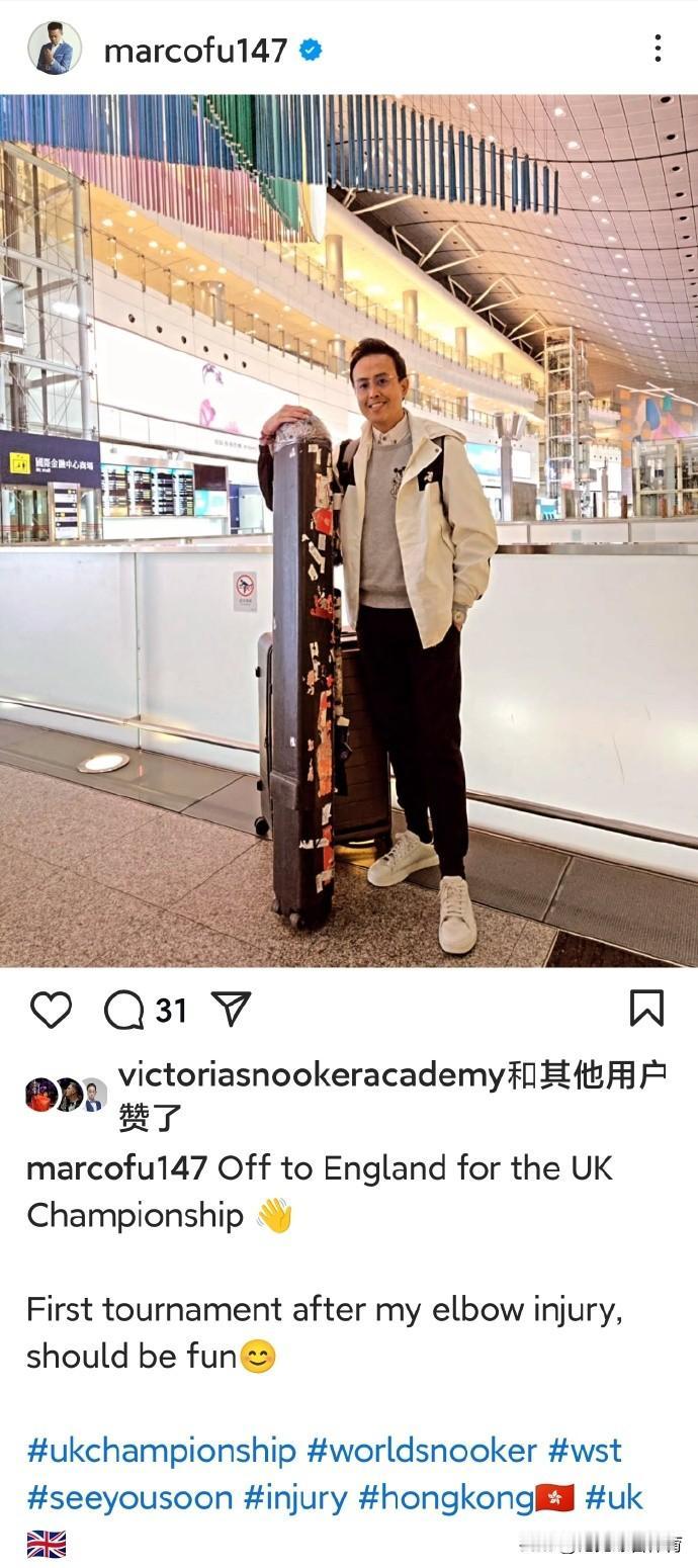 斯诺克:傅家俊确定参加2025斯诺克英锦赛 昨天,休战已久的傅家俊晒照前往英国参加英锦赛资格赛。此前他因为手肘受伤,已经连续退出多站比赛。 本届英锦赛资格赛将在11月22日开打。