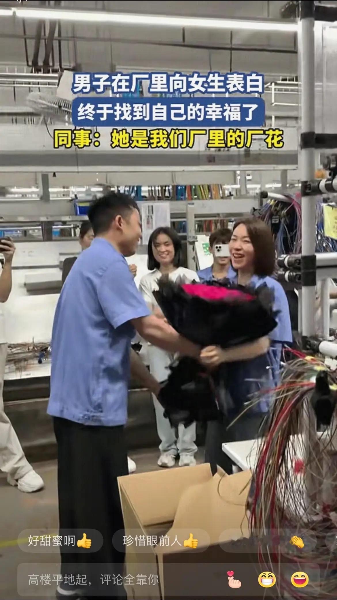 真的是太幸福了!一名男子看上了自己的一个女同事,经过一段时间的接触,男子觉得女同事应该对自己也有好感,于是便买了一大束玫瑰花当着全厂的同事和她表白了,女同事幸福的接过花,脸上洋溢着害羞的笑容。 这事发生在广东东莞一家电子厂,表白的男生叫阿明,28岁,是车间里的技术骨干;女生叫晓婷,比他小两岁,在质检部门工作。两人在同一个厂区上班,低头不见抬头见,一来二去就熟悉了起来。阿明性格沉稳,做事踏实,晓婷温柔细心,待人热情,车间里的同事早就看出两人互相有好感,总爱拿他们开玩笑。 表白那天是周五下午,工厂提前半小时下班,大家正收拾东西准备回家,阿明突然抱着一大束红玫瑰冲进了车间。那束花足有99朵,用透明玻璃纸包着,红得耀眼,引得在场同事一阵惊呼。阿明走到晓婷面前,脸颊涨得通红,双手有些发抖,却眼神坚定地说:“晓婷,认识你一年多,每次加班你都会给我带热饭,我机器坏了的时候你会默默守在旁边帮忙递工具,跟你在一起的每一天都很开心。我不想再只做你的同事,你愿意做我的女朋友吗?” 晓婷站在原地,眼睛一下子就亮了,双手下意识地绞着衣角,害羞得不敢抬头。周围的同事们瞬间炸开了锅,有人拍着手喊“答应他”,有人拿出手机录像,还有几个调皮的男生吹起了口哨。车间主任也笑着站在一旁,打趣道:“阿明可以啊,藏得够深!晓婷,这么好的小伙子可别错过了!” 听到大家的起哄,晓婷慢慢抬起头,看着阿明紧张又期待的眼神,嘴角忍不住上扬,接过玫瑰花的那一刻,脸颊红得像熟透的苹果。“我愿意。”她轻声说道,声音不大,却清晰地传到了每个人耳朵里。车间里立刻响起雷鸣般的掌声,阿明激动得不知所措,伸手想牵晓婷的手,又不好意思地缩了回去,最后还是晓婷主动挽住了他的胳膊,两人在同事们的祝福声中走出了车间。 后来听车间的大姐说,阿明为了这次表白准备了很久。他提前半个月就开始打听晓婷喜欢什么颜色的玫瑰,还特意请教了厂里的女同事,知道晓婷害羞,原本想私下表白,可又觉得不够正式,想让全厂同事见证这份心意。为了买这束花,他省了半个月的早餐钱,还特意调了早班,提前下班去花店取花。 晓婷也跟闺蜜分享过两人的相处细节。她说阿明虽然不善言辞,却特别细心。她上次感冒发烧,阿明默默给她买了退烧药和红糖姜茶,还帮她顶了半天的班;她喜欢吃家乡的腊肉,阿明知道后,特意让老家的亲戚寄了一大块过来,悄悄放在她的工位上。这些点点滴滴的小事,让她慢慢对这个踏实的男生动了心。 这段表白视频被同事发到网上后,很快就火了。网友们纷纷留言送上祝福:“这才是爱情最美好的样子,简单又真诚!”“厂里的爱情太好磕了,没有华丽的辞藻,却全是真心”“看着晓婷害羞的笑容,真的被甜到了”。还有不少网友分享了自己在工厂收获爱情的经历:“我和我老公就是在电子厂认识的,他当年也是当着同事的面向我表白,现在孩子都三岁了”。 其实在工厂里,这样的爱情很常见。大家每天一起上班、一起吃饭、一起加班,朝夕相处中培养出的感情,纯粹又牢固。没有复杂的套路,没有物质的攀比,喜欢就是喜欢,表白也直接又热烈。阿明和晓婷的故事之所以让人觉得幸福,就是因为他们的感情里满是真诚和烟火气——是加班时递过来的一杯热水,是生病时默默的照顾,是攒了半个月工资买的玫瑰花,是众人面前勇敢的告白。 现在很多人觉得爱情需要轰轰烈烈,需要昂贵的礼物和浪漫的场景,可阿明和晓婷的故事告诉我们,真正的幸福往往藏在平凡的日常里。一个真心的付出,一句勇敢的表白,就能收获最真挚的感情。在快节奏的当下,这样简单纯粹的爱情,反而更让人羡慕。 阿明和晓婷现在已经确定了恋爱关系,两人还是像以前一样在厂里上班,只是下班后会一起去吃饭、散步。同事们都说,看到他们就觉得很治愈,原来爱情可以这么简单美好。 爱情不分场合,不分身份,只要彼此真诚相待,就能收获幸福。阿明和晓婷的故事,不仅温暖了全厂同事,也让更多人相信,平凡生活中也能开出最美的爱情之花。 各位读者你们怎么看?欢迎在评论区讨论。