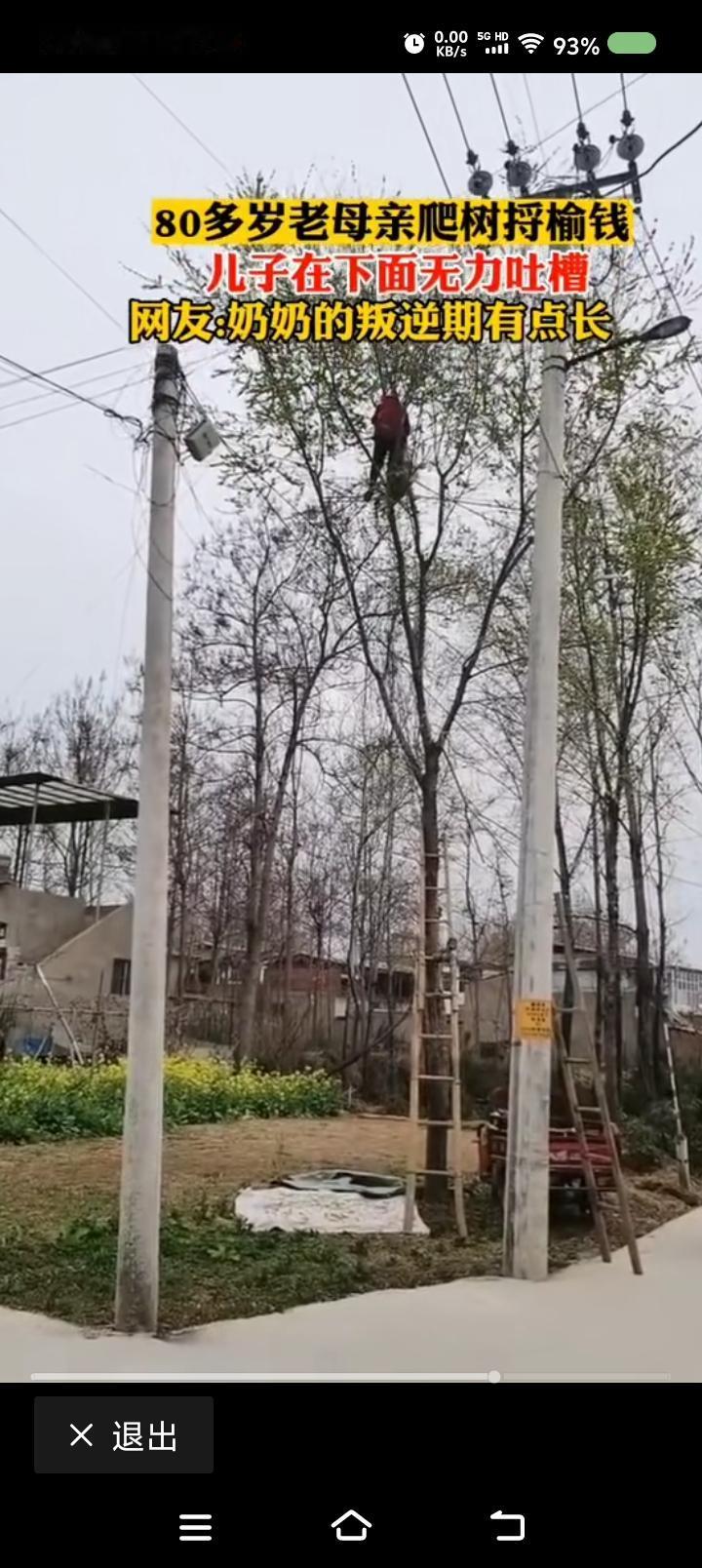 80多岁的老人爬树摘榆钱?—— 网上视频:一80多岁的老母亲搭梯子上树,摘榆钱。夕阳不见,断肠人在树下。 点评: 评论区网友纷纷讨伐父母的“叛逆期”:有的上树剪枝条的,有的年龄很大,不缺钱偏偏喜欢捡垃圾,有的……受伤的不少,有的故去。 我村有个例子:多年前,有个人上果树干活,摔了,花了好几万。 人要服年龄,力所能及的范围内行事。这个范围由规律确定。不可侥幸。