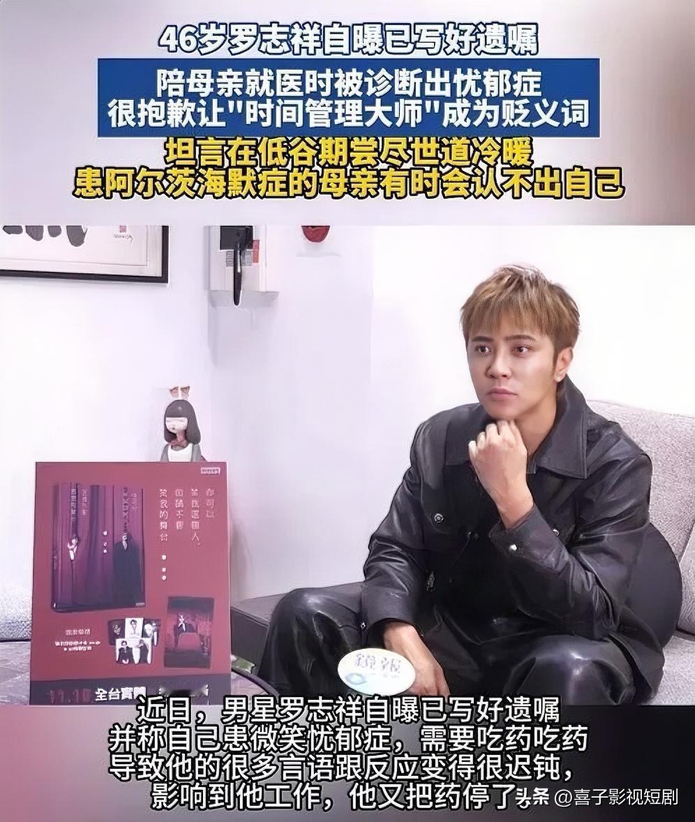 罗志祥自曝写好遗嘱,背后原因令人唏嘘 近日,46岁的罗志自曝已写好遗嘱,还称自己患上微笑忧郁症,需吃药治疗。但药物影响让他言语、反应迟钝,影响工作,他便停了药。他透露留遗嘱是因“不知哪天老天爷关掉开关”。此前他事业顺遂,参演多部影视、综艺。可2020年周扬青爆料其私生活问题,让他形象受损。如今又曝出健康问题,令人感慨。