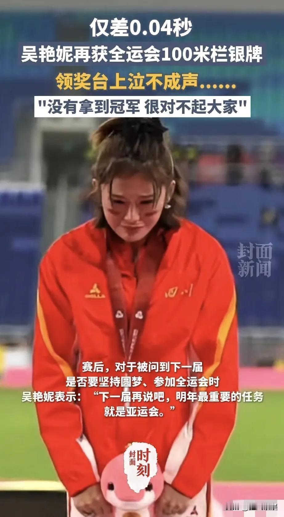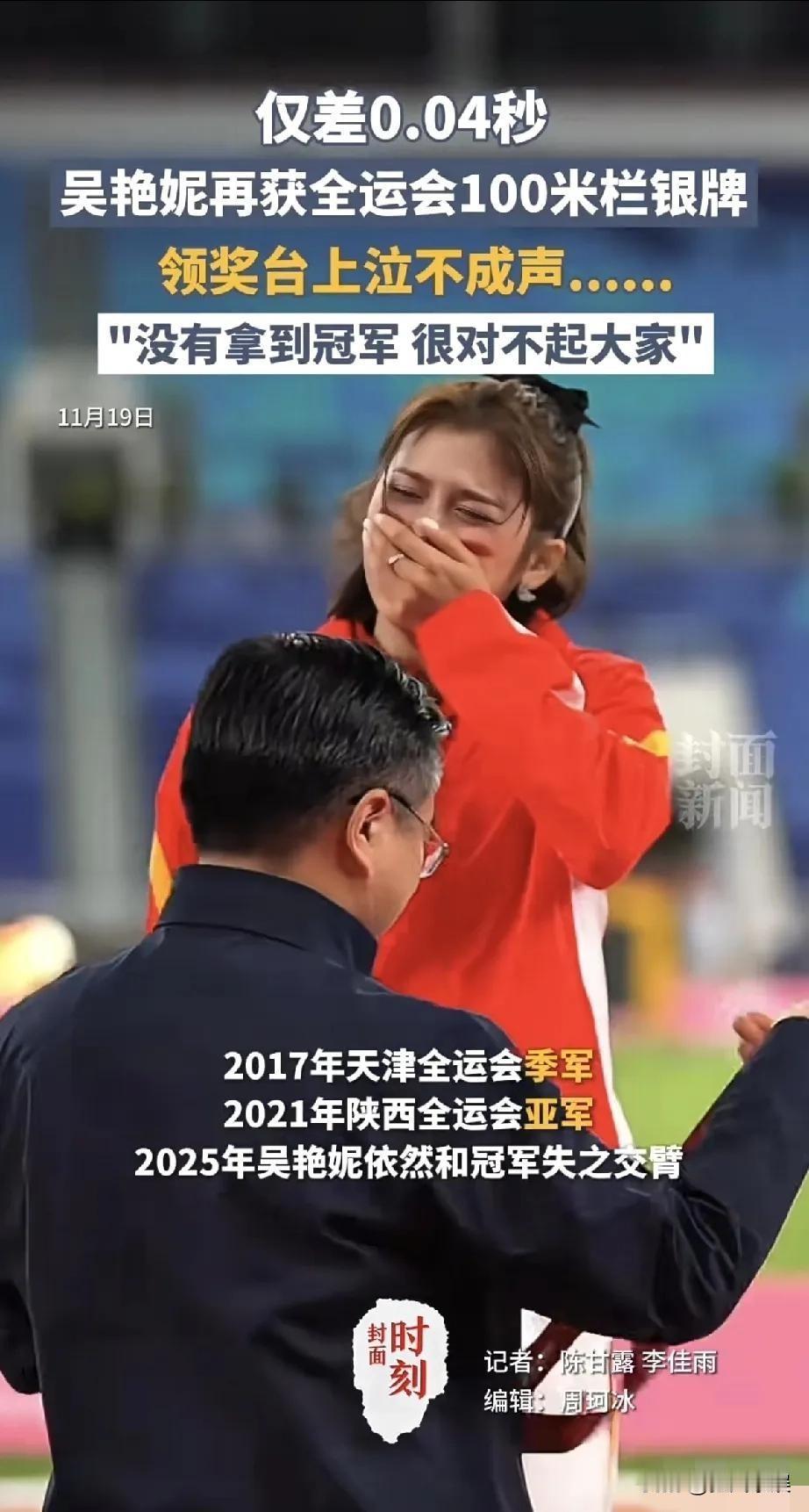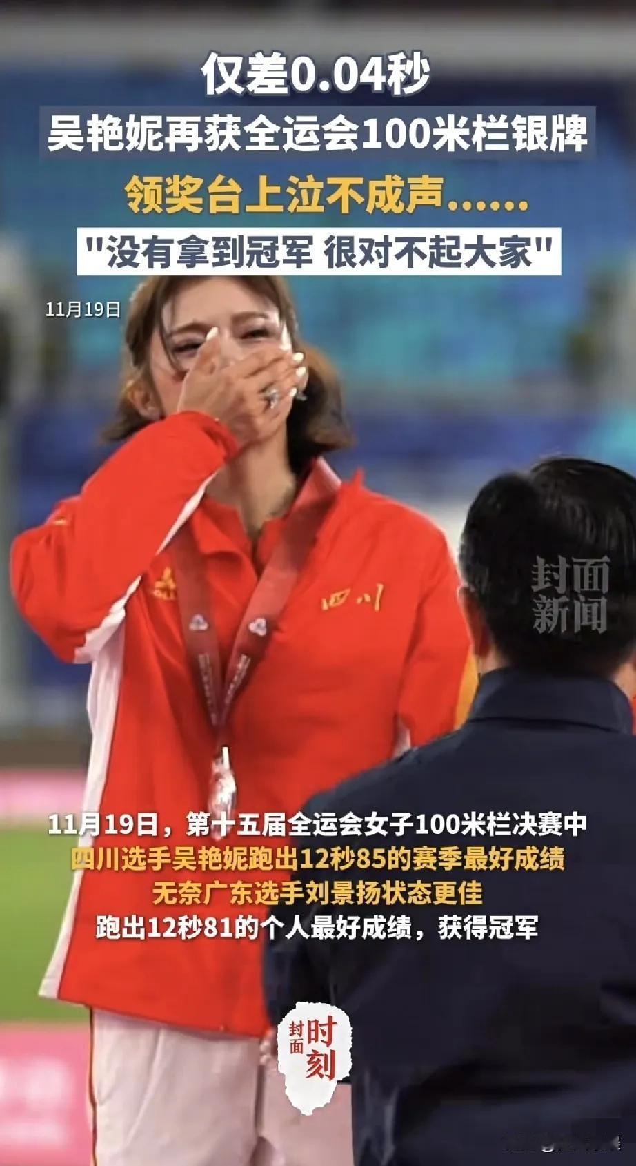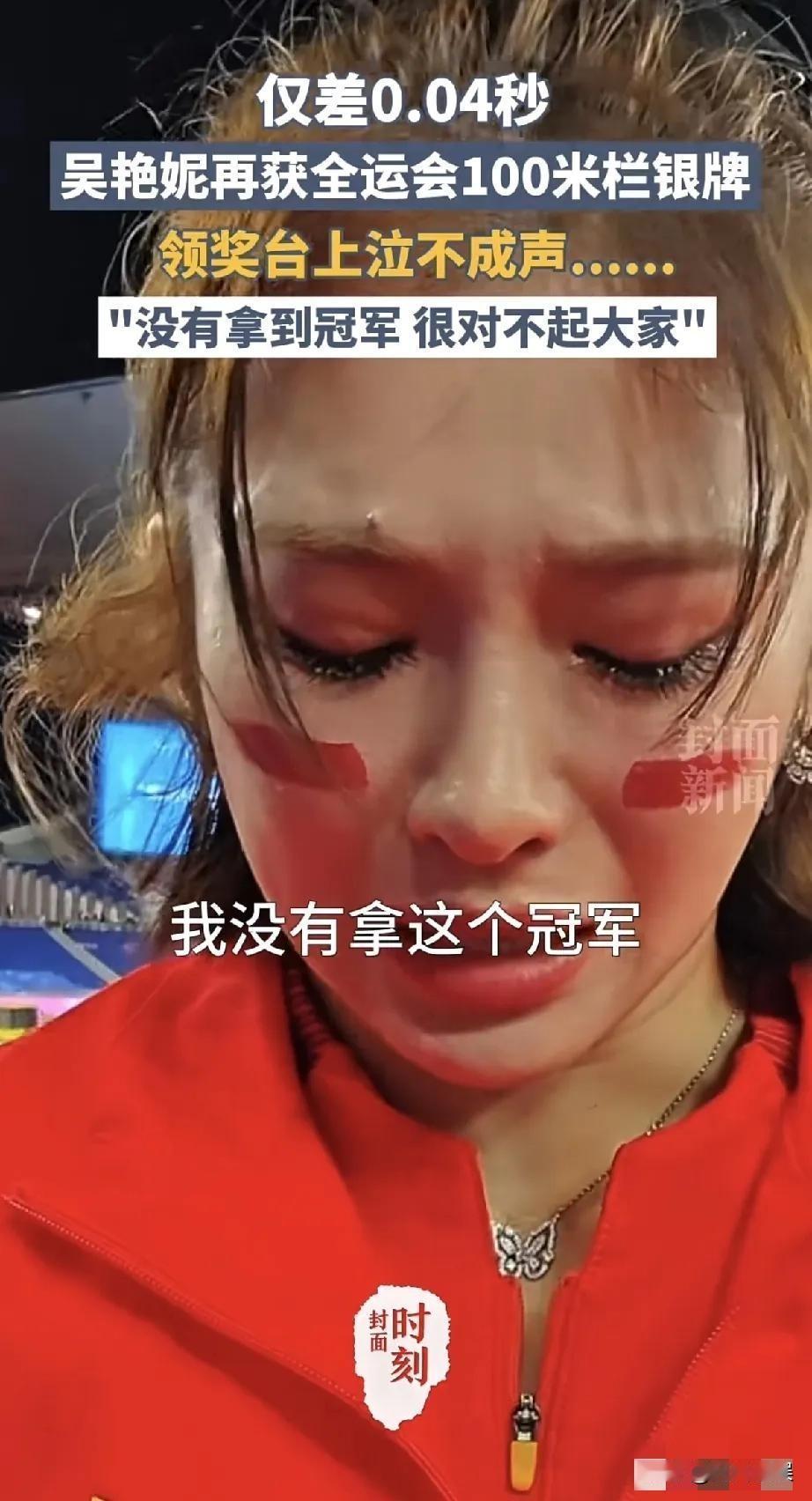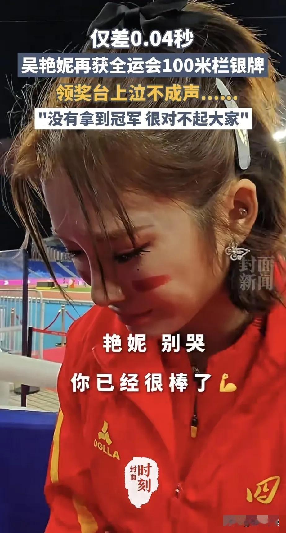 吴艳妮,太让人心疼了! 11月19日,全运会女子百米跨栏决赛中,吴艳妮跑出了12秒85的成绩,却哭到不行,网友纷纷直呼:吴艳妮太可怜了,竟然哭成这样! 吴艳妮跑出12秒85的成绩获得亚军,而冠军是广东选手刘景扬,跑出了12秒81的成绩,只有0.04秒之差,吴艳妮哭成这样,像是受了很大委屈,颁奖时也一直在哭,哭的梨花带雨,她说对不起喜欢她的粉丝,让大家失望了。 网友纷纷直呼: 别哭,你已经很优秀了,只不过是比赛竞争很激烈,稍不留神就被越了。 不过,吴艳妮的状态看起来很不好,有粉丝采访,她也不理,低着头直接走了,我想说,不要太伤心,相信还会有更好的机会。