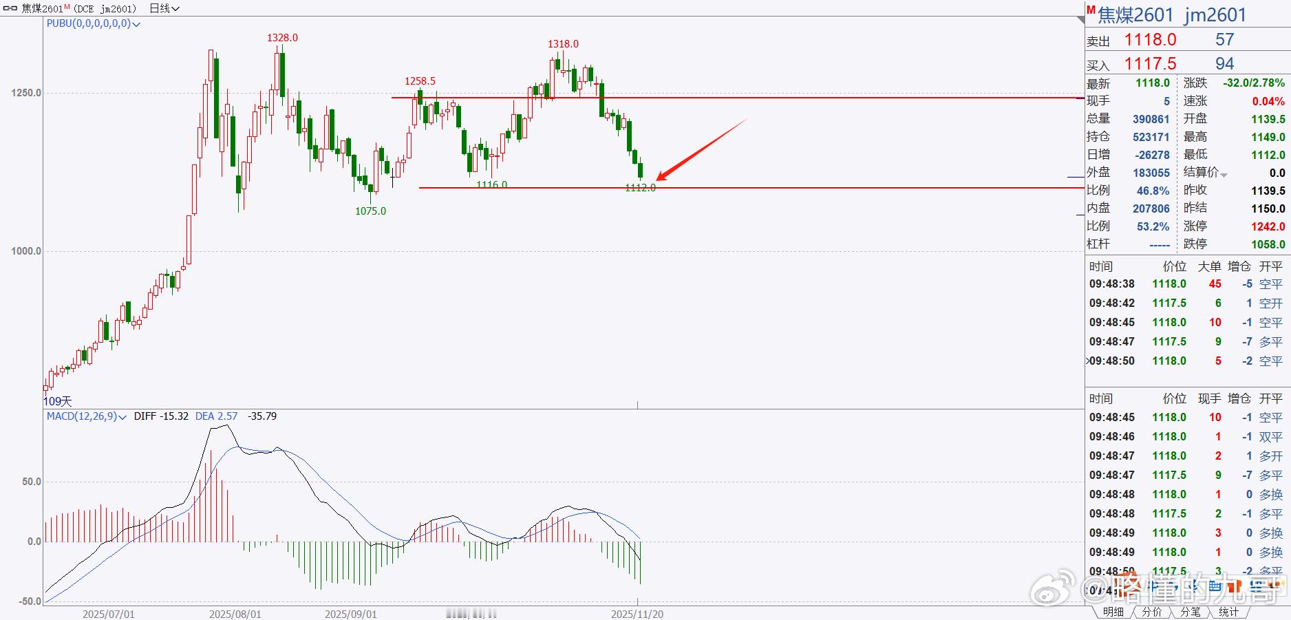 焦煤不用说了吧,完全按照我们的预期运行!现在到了重要位置了,就看能不能收长下影线了,能收长下影线,就有反弹概率,继续收阴线,下的概率继续加大!