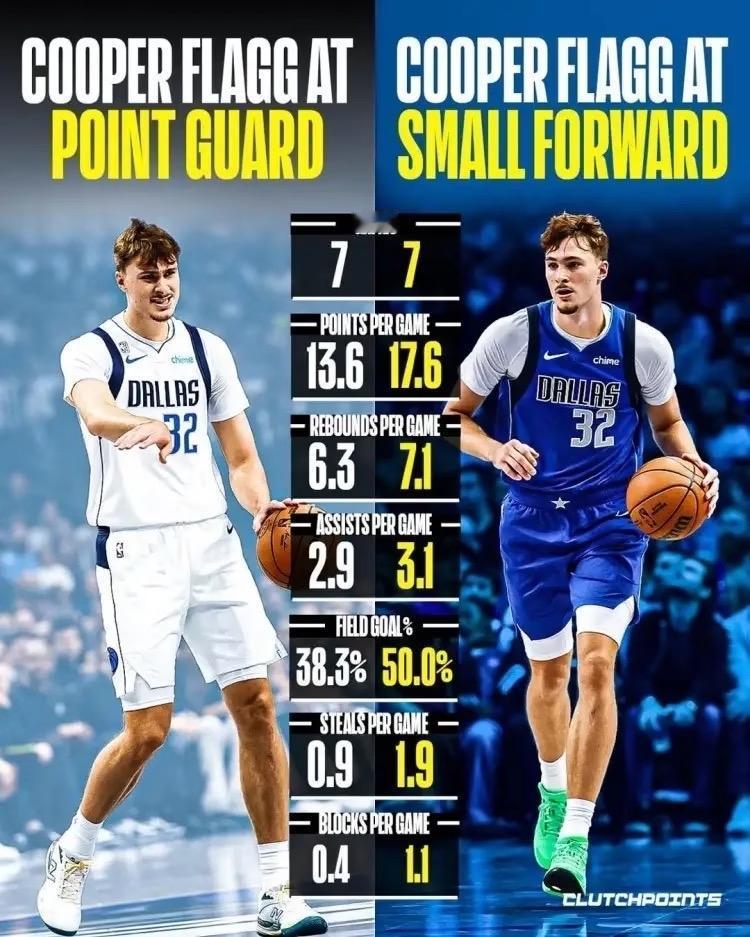 弗拉格打小前锋:场均17.6分7.1篮板3.1助攻1.9抢断1.1盖帽,命中率50.0%。 弗拉格打控卫,场均13.6分6.3篮板2.9助攻0.9抢断0.4盖帽,命中率38.3%。 目前独行侠的14场比赛,刚好对半分,弗拉格打了7场控卫,发现效果不佳之后,又打了7场小前锋,在各项数据上都要比控卫更好。 基德自己是控卫出身,对于比赛的理解本身就要比其他位置的球员更高,他希望弗拉格能够有足够的球商去处理比赛,但弗拉格毕竟年轻,刚刚打职业比赛,想的越多越容易犹豫,弗拉格赛季初就是这种状况。 但只要打到他熟悉的小前锋位置上,不去带动队友,那弗拉格会表现的好很多。要想像基德一样组织球队进攻,那需要年龄再大一些,再成长几年,才能有些效果。