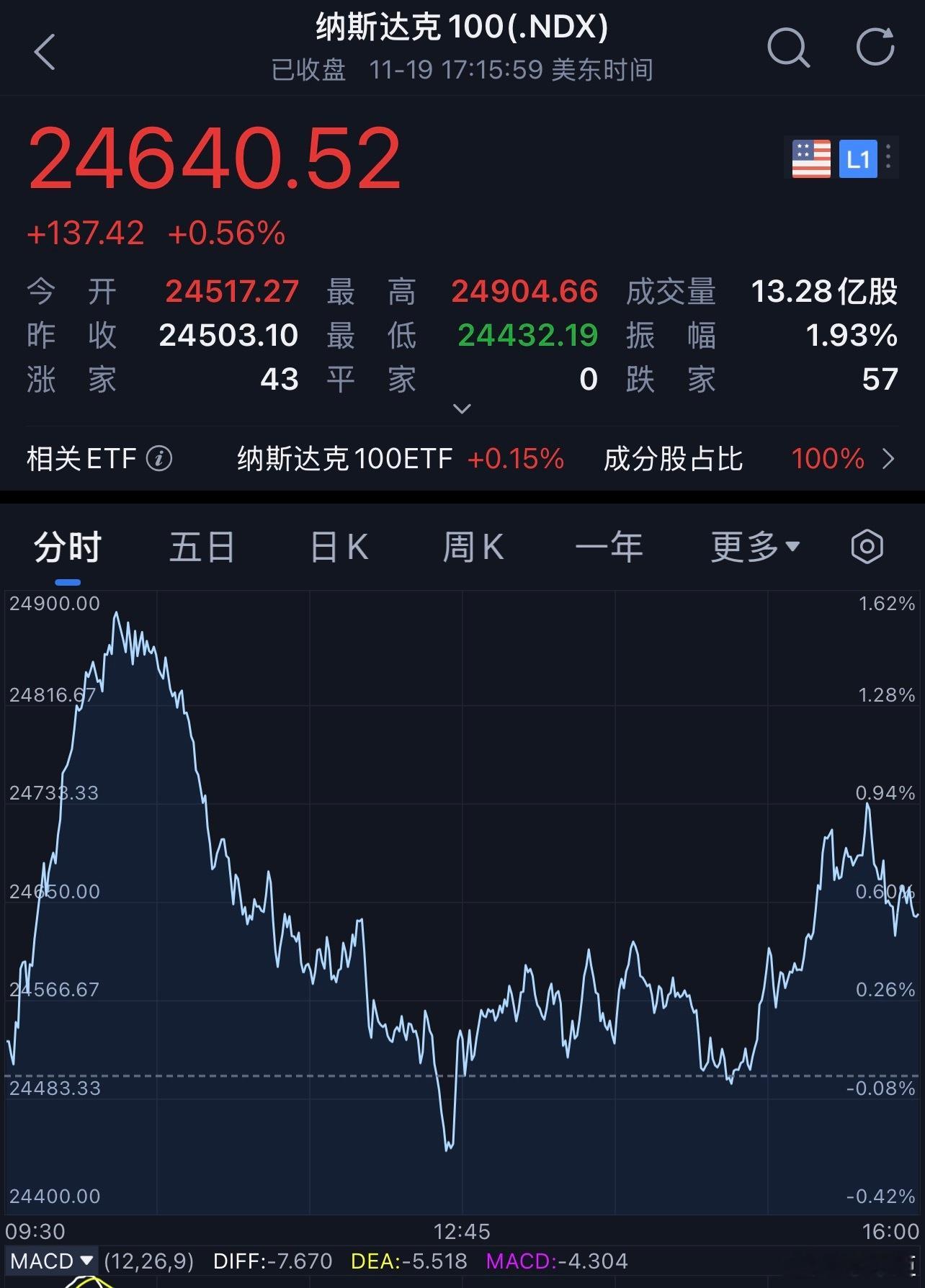 老板们早安,打卡养铁咯美股在连跌四日后迎来反弹,三大指数集体收涨,纳指领涨,上涨0.6%。截至收盘,道琼斯指数涨0.10%,报46,138.77点;标普500指数涨0.38%,报6,642.16点;纳斯达克指数涨0.59%,报22,564.23点。财报显示,英伟达第三财季营收为570.1亿美元,超出市场预期的549.2亿美元;净利润为319.1亿美元,同比大涨65%,经调整后的每股收益为1.30 美元,高于市场预期的1.25美元,股价盘后上涨超4%。热门中概股多数下跌,纳斯达克中国金龙指数跌1.54%。国际金价窄幅震荡。