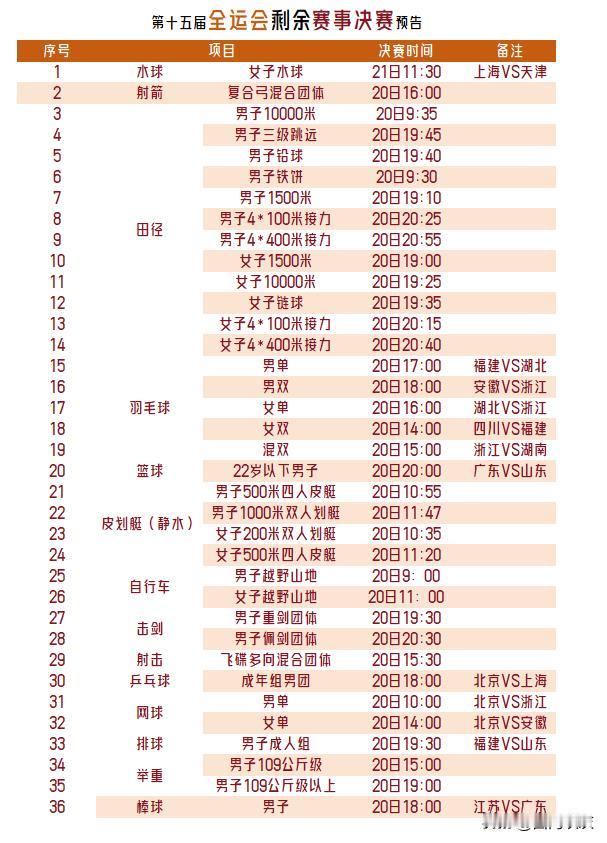 【仅余36项!全运会剩余赛事决赛预告!】 第15届全运会仅余两个比赛日,但实际上决大多数项目都会在20日收官。 36项比赛其中35项都将于今晚完赛,只有女子水球将于明天上午11:30开赛。 目前剩余36项比赛,其中12项比赛已锁定奖牌,北京、浙江和福建在剩余乒乓和网球项目中锁定三枚奖牌,山东、广东、上海、安徽这些团队均已进入决赛,至少是银牌。