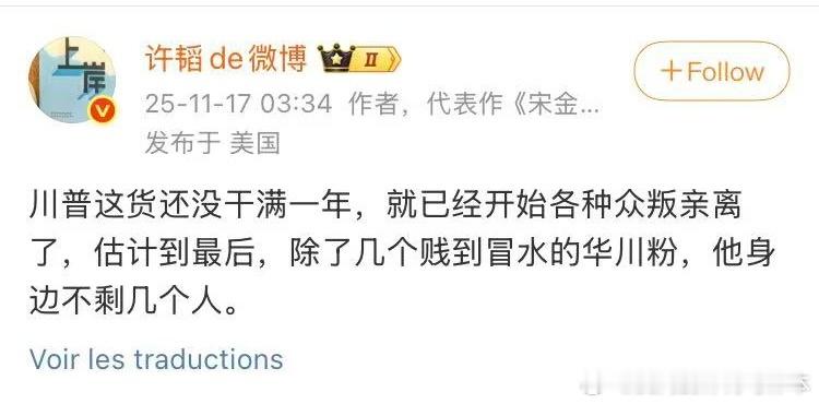 【黄金时代】太神了!微博反川名将的许韬定律再发神威!11月17日,许韬可能是因为马娇蕊的事儿?说“川普众叛亲离,到最后除了****的华川粉,他身边不剩几个人”话音未落,三天后,ins有7亿粉丝的C罗(影响力就不用多说了),亲自为川普站台,C罗甚至称颂川普的勇气,责任,以及和平理念,给了像他这样的新一代人的启示!许韬定律再发神威,只要他说什么,相反的事情马上夸张的印证!谢谢您对此事的关注!