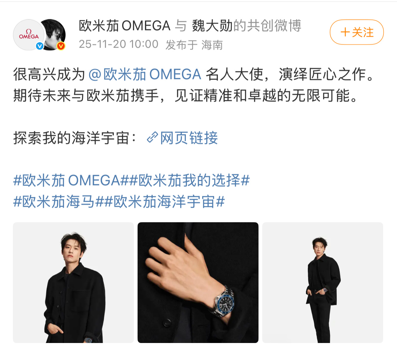 魏大勋宣了欧米茄名人大使。(品牌第7位在任名人大使)