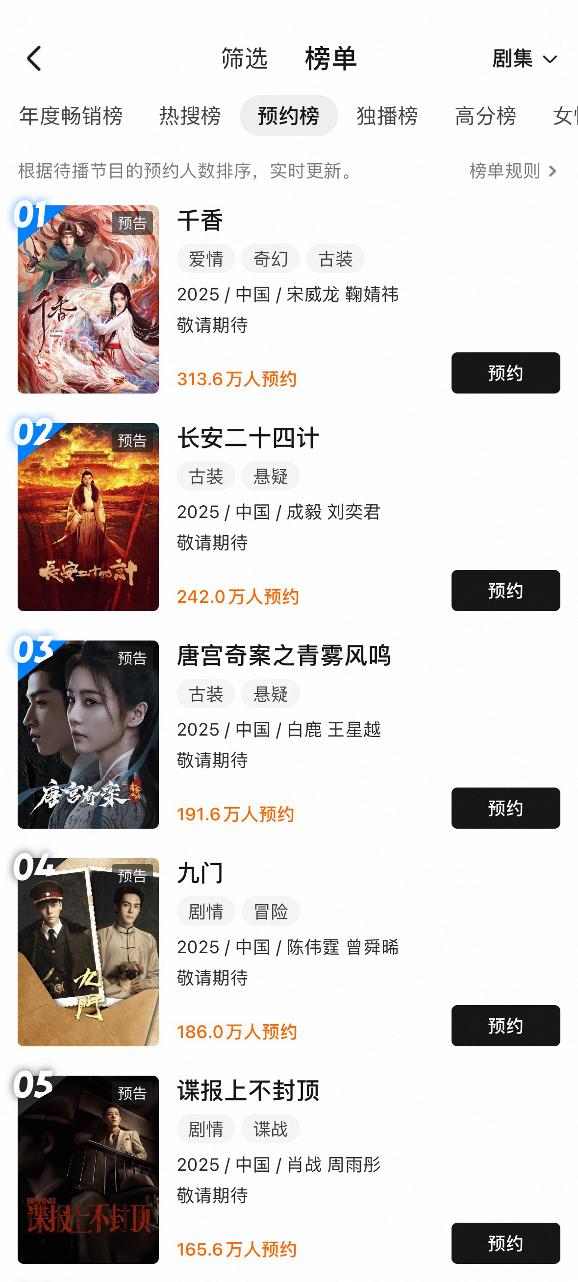 优酷预约榜前五,顶流打架,你期待哪部❓1,宋威龙 鞠婧祎 《千香》 2,成毅 刘奕君 《长安二十四计》 3,白鹿 王星越 《唐宫奇案之青雾风鸣》4,陈伟霆 曾舜晞 《九门》5,肖战 周雨彤 《谍报上不封顶》