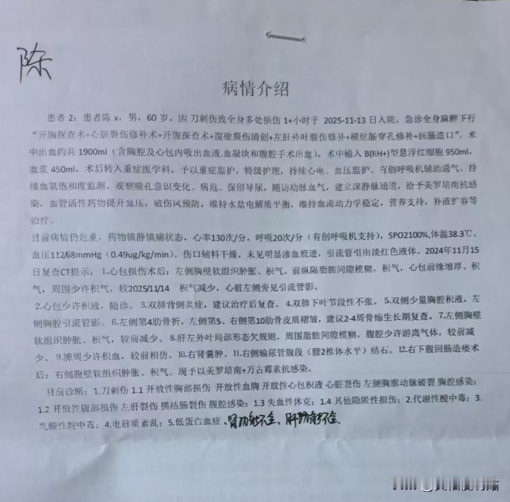11月13日,重庆合川60岁的陈奎在家中听到楼道里女孩的凄厉呼救,毫不犹豫冲出去制止歹徒行凶,却被连捅5刀,心脏、胸腔等多处重伤,至今仍在ICU昏迷不醒。每天高达1万多元的治疗费,让普通家庭难以承受,女儿无奈发起筹款求助。 隔着重重的ICU玻璃窗,几乎认不出陈奎是个60岁的退休老人,此刻,他躺在重庆医院的病床上,身体上插满了管子,面部因为严重的药物反应和外伤,肿胀得令人不忍直视。 陈奎的身体正承受着极限的伤害,医生的伤情报告上写着:开放性胸部损伤、血胸、心脏裂伤——他的胸部被利刃划过,伤口几乎深入心脏,连心包膜也被撕开,导致他失血性休克,命悬一线。 事情的起因发生在11月13日下午,当时,楼道里突然传来一名女孩的尖叫声,听得让人不寒而栗。 陈奎的第一反应就是冲了出去,眼前的景象让他立刻判断出事态的严重性:一名女孩已经失去反抗能力,面前是一名持刀疯狂拉扯的男子。 尽管陈奎年纪大,身材瘦弱,但他没有一丝犹豫,毫不迟疑地扑向了那个持刀的男子,死死抓住他的胳膊。 这场力量悬殊的搏斗,几乎注定了悲剧的结局,陈奎用自己的身体,为女孩挡下了一刀又一刀,直到五刀刺入他的胸膛。 鲜血迅速浸透衣物,顺着楼道蜿蜒流淌,邻居们被吓坏了,但还是鼓起勇气打开门,扔出毛巾帮忙止血。 陈奎倒下后,依然保持着护人的姿势,直到意识模糊,最后他用几乎听不见的声音拨通了女儿的电话。 接下来的治疗过程犹如噩梦,陈奎被紧急送到合川区人民医院,历经7个小时的手术才总算脱离了生命危险。 但是危机远未解除,11月14日凌晨,病情再度恶化,监护仪报警,紧急转院至重庆新桥医院,虽然命保住了,但对这个普通家庭来说,未来的一切都变得不确定。 陈奎的妻子没有固定收入,女儿和女婿都是收入有限的普通职员,家里还有正在上学的孩子,家庭的积蓄早已所剩无几,面对日均超过一万元的治疗费用,他们几乎无法承受。 更糟糕的是,女孩也躺在同一医院的ICU里,两个家庭在生死边缘挣扎,一场不幸让他们从温饱走到了贫困的边缘。 绝望蔓延,陈奎一家借遍亲戚朋友,但资金依然捉襟见肘,直到11月17日,家里的积蓄彻底耗尽,女儿无奈之下只得在网络筹款平台上求助,眼含泪水,按下了“发布”按钮。 没想到,这一求助信息像火种般迅速蔓延开来,来自陌生人的捐款不断涌入,从几十元到上千元不等,许多人在评论区留言表达关心:“好人不能再受苦,大家一起帮帮他。” 随着捐款的涌入,更多的帮助和支持也紧跟而来,当地警方已经控制了行凶者,陈奎的英勇行为也得到了官方认可,被确认属于“见义勇为”,更让人宽慰的是,政府的介入及时为家庭带来了保障。 11月18日的官方通报中,政府承诺将协调解决陈奎的医疗费用问题,后续治疗方案也将由政府负责,这无疑是为这个无助家庭撑起了最后的一片天。 陈奎为保护他人而作出的牺牲,已经引发了社会的广泛关注和支持,从最初邻居递出毛巾止血,到政府出面为医疗费用提供保障,这一系列的行动逐步形成了一个温暖的闭环。 虽然嫌疑人已被捕,但这场正义的接力赛仍在继续,陈奎的家庭和社会一起,正在为一个更好的未来而努力。 我们无法要求每个人都在危险面前挺身而出,但当英雄真的出现在我们身边时,社会的安全网一定要牢牢守住,确保他们的身后有一个可靠的支持,保护他们的身体和家庭。 这不仅仅是对陈奎个人的回馈,更是对每个见义勇为的人应有的尊重与保障。