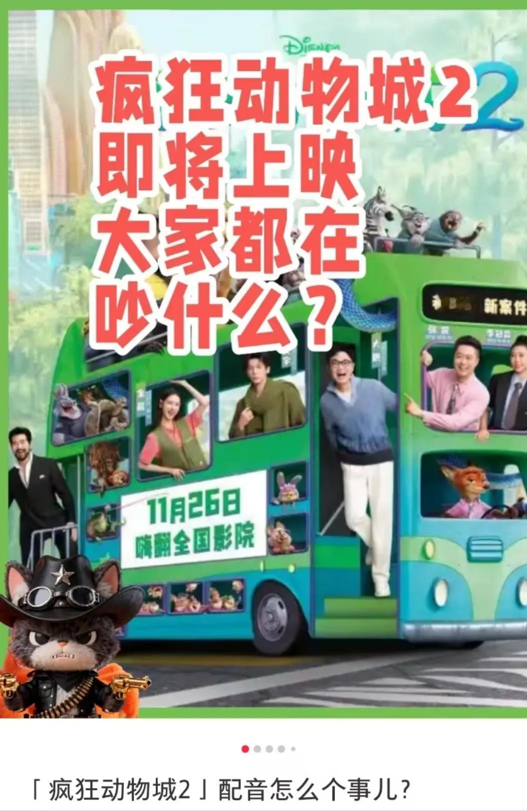 疯狂动物城2找明星配音引争议 说句掏心窝话,看到《疯狂动物城2》公布明星配音阵容,我竟然松了一口气。 季冠霖和张震接着给朱迪尼克配音,前作里这俩声音一出来,那对爱斗嘴的探案搭档立马活了,有他们在,角色的魂儿就稳当。 大鹏配蛇盖瑞,费翔配马市长,金晨王安宇也来了,大鹏喜剧感足,盖瑞那股子天真劲儿他准能演活;费翔声音有磁性,马市长的风度他拿捏起来应该不难。 谁说明星配音就撑不起场面?专业配音稳基础,明星演员添特色,这阵容,能不叫人盼着11月26日赶紧到?疯狂动物城 疯狂动物城2