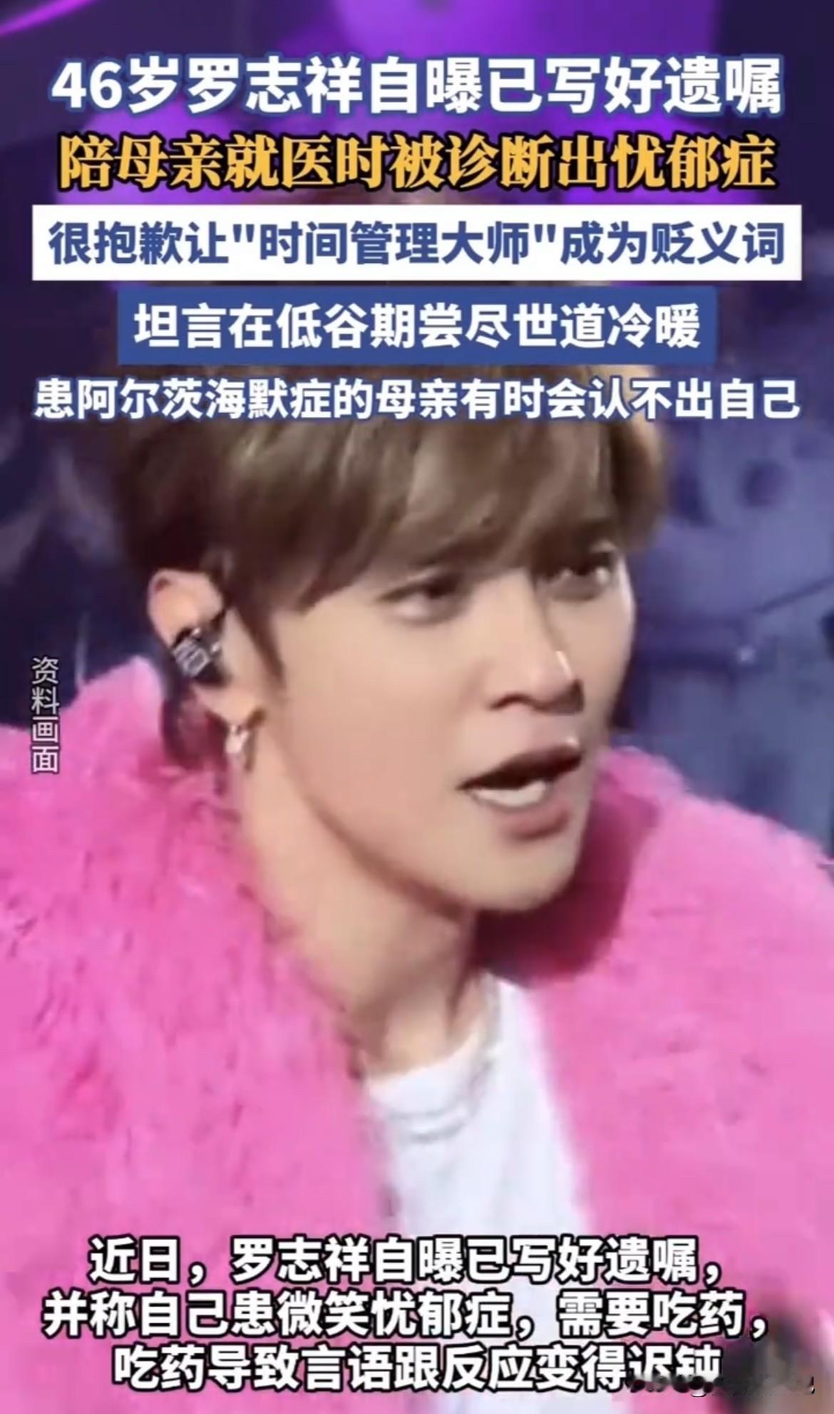 46岁的罗志祥自曝患上微笑忧郁症,还写好遗嘱,挺让人意外的。他说吃药让自己言语和反应变迟钝,影响工作只能停药。 微笑抑郁症患者人前常面带笑容,独处或面对亲近的人才会流露痛苦。抑郁症表现多样,比如情绪低落,觉得自己干啥都不行;思维迟缓,脑子像生锈的机器;意志活动减退,啥都不想做,不愿社交。 罗志祥曾是娱乐圈顶流,如今这番状况让人唏嘘。不知道他后续状态会怎样,希望他能早日走出阴霾。