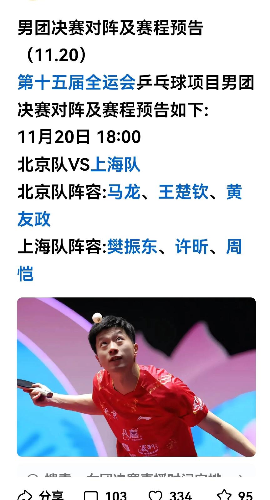 预测一下,今天谁能登顶? 全运会男子团体决赛, 上海队和北京队, 谁的胜算更大? 男双:马龙黄友政对阵许昕周凯,很难预料, 单打:樊振东和王楚钦。又是一场关注度极高的,单打大头输了,团体赛一单赢的可能性感觉也不是太大。 二单:黄友政和周凯,势均力敌。 上海队应该可能性会更大。 让我们拭目以待。