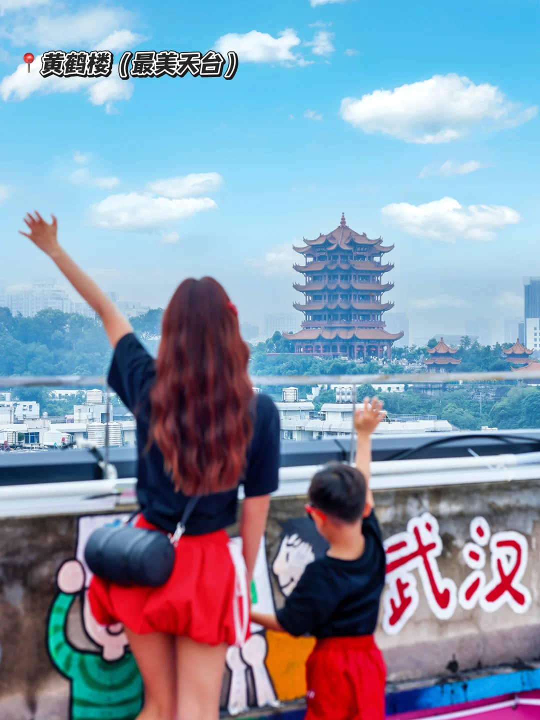 远眺黄鹤楼、长江大桥,轻松拍到与黄鹤楼同框,天台上还画着各种武汉地点的涂鸦,