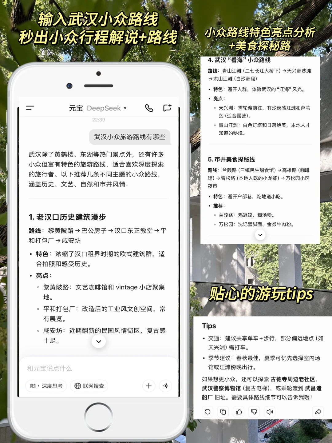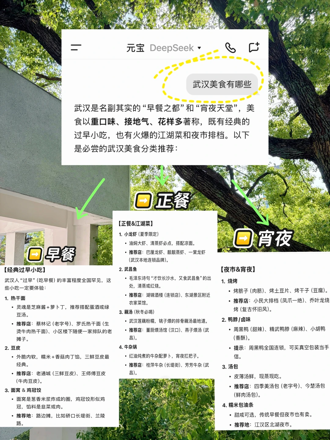 ✔️每去到一个城市旅游,在做攻略上我都是用的【腾讯元宝】,省去了翻阅资料的时间,一键整理好你想要的游玩路线,省时省力,这份攻略就是元宝🔍出来的小众游玩路线,包括武汉的各种美食、拍照姿势、游玩路线、交通,衣服色彩搭配他都能很快整理好!还是我自媒体小助手,不论是生活还是出门在外,都是能及时处理问题的好帮手
