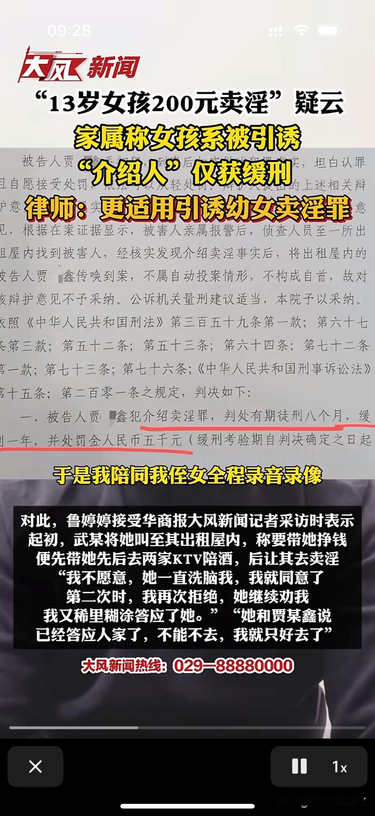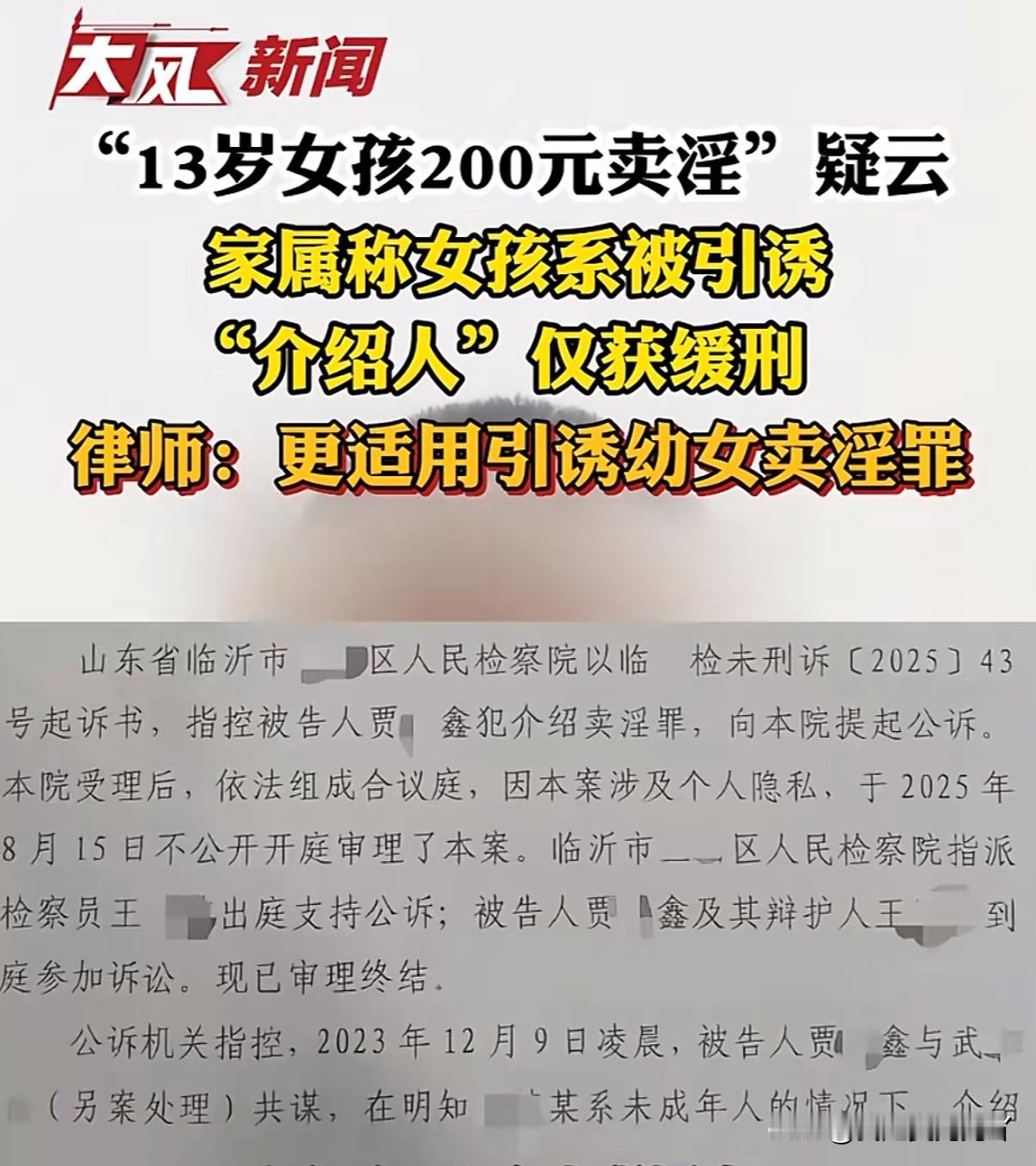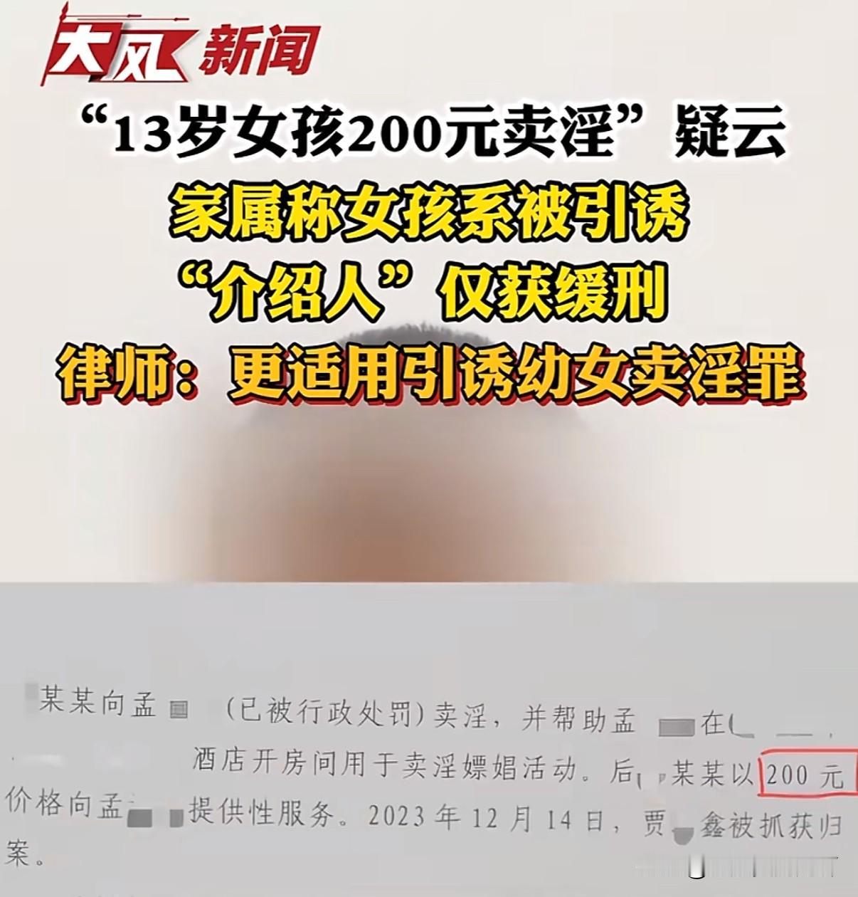 不合常理到你看了都会问一句这是不是假新闻的程度 一个刚满13不满14岁的女孩被人多次诱骗卖淫法院判决却以女孩口供自愿为由将其认定为“卖淫女” 多次将她介绍给瓢虫的介绍人仅被判8个月并缓刑一年他甚至连牢都不用坐!女孩子家属在法院判决生效几个月后打电话询问案件进展才得知已经结案,面对审判结果家属提出不服却因女孩被认定为“卖淫女”的身份连上诉的权利都没有 山东临沂14岁女孩婷婷(化名)是一名弃婴由王某父母收养,23年刚上初中的婷婷消失数天未归王某报警后得知婷婷在“朋友”21岁周某诱导下多次介绍卖淫,周某从中获利上万元 25年法院判定周某为“介绍卖淫罪”而不是“引诱幼女卖淫罪”念其初犯且认罪态度良好从轻处罚有期徒刑8个月缓刑一年 25年10月28号王某询问案件进展得知案件在9月23号已经宣判。 王某对于法院判决不服、侄女说周某带他卖淫三次法院只认定一次金额为200元,与事实不符,王某申请再审但因女孩被认定为“卖淫女”的身份被告知无权申请 要知道女孩婷婷不满14岁,身心都不成熟她说的自愿是自愿吗?国家对文中两项罪名有一个明确的分界线就是年龄。 一个不满14岁的女孩从此被扣上“卖淫女”的身份,这样的判决真的对吗? 信源:大风新闻