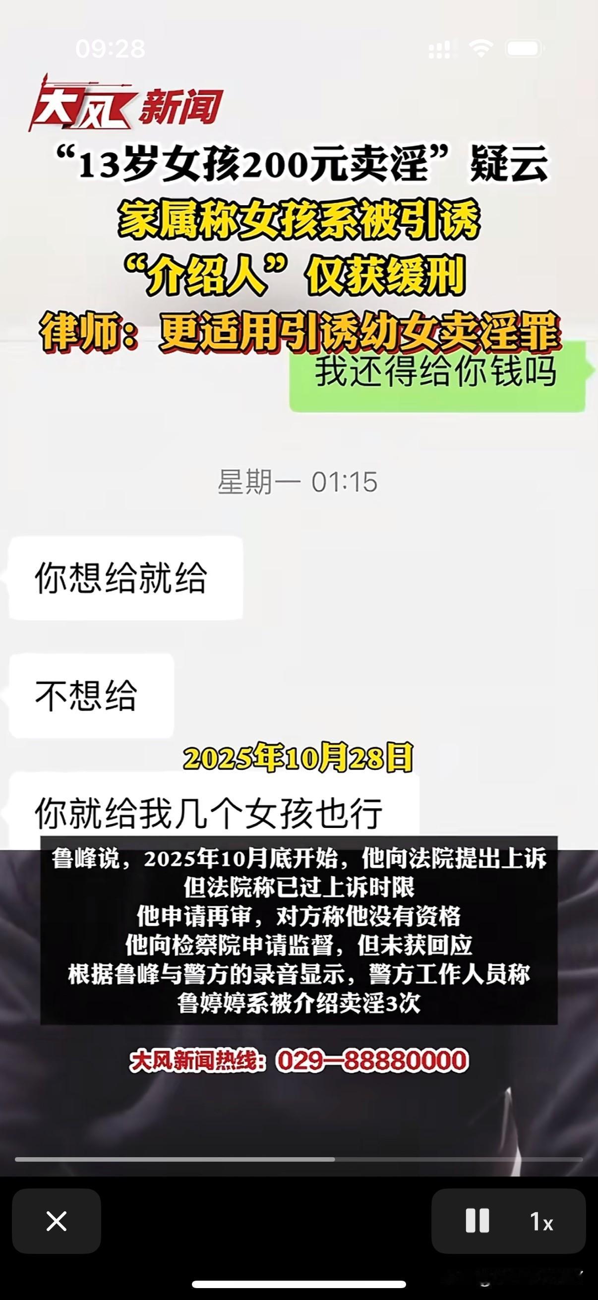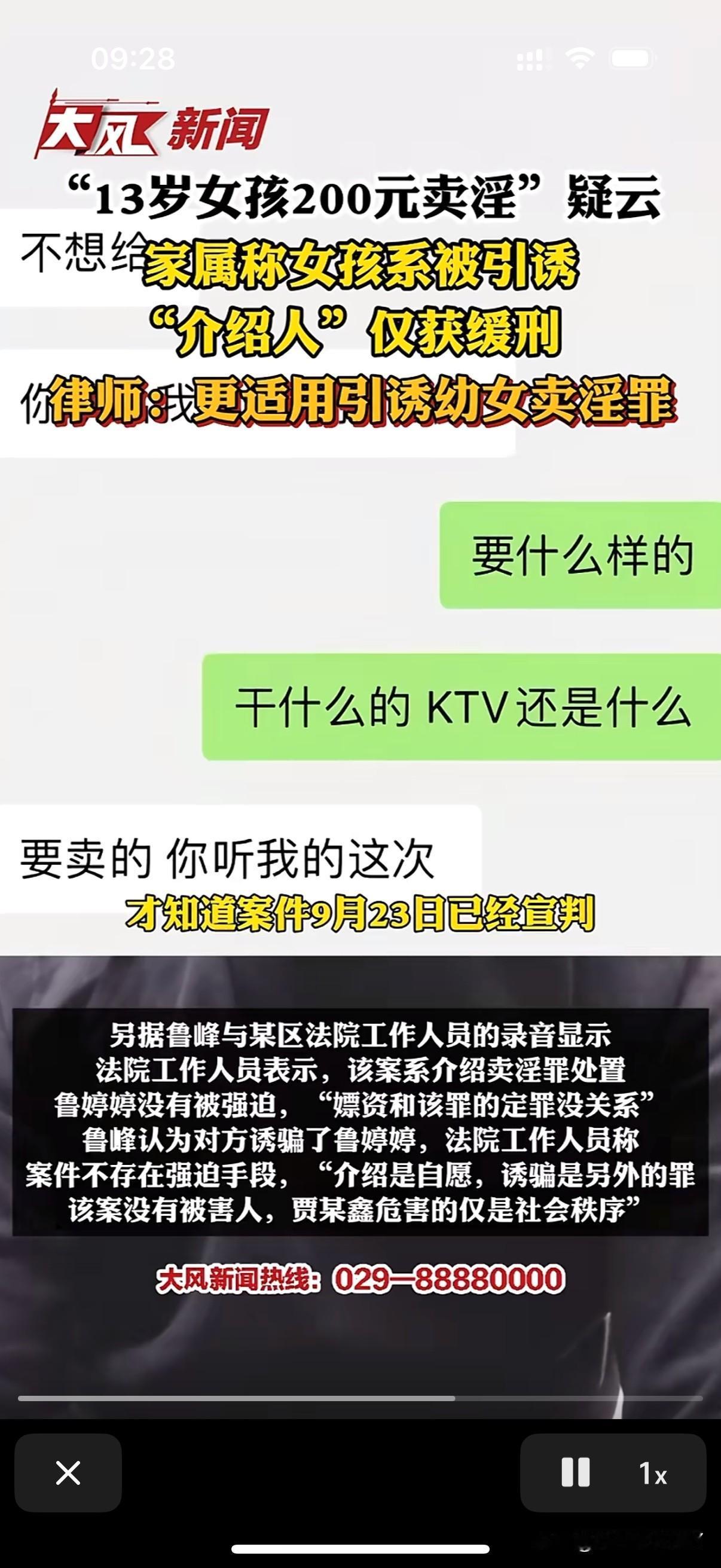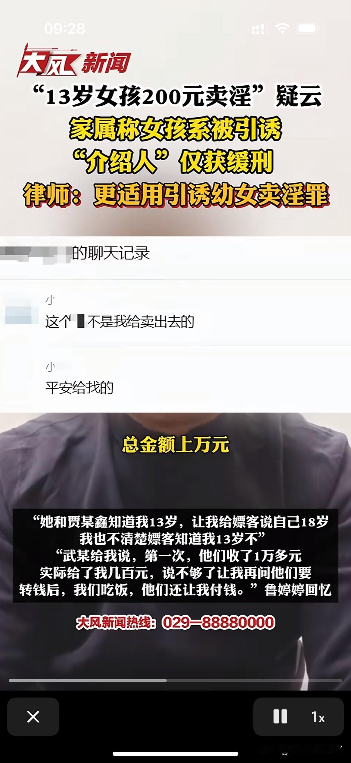 不合常理到你看了都会问一句这是不是假新闻的程度 一个刚满13不满14岁的女孩被人多次诱骗卖淫法院判决却以女孩口供自愿为由将其认定为“卖淫女” 多次将她介绍给瓢虫的介绍人仅被判8个月并缓刑一年他甚至连牢都不用坐!女孩子家属在法院判决生效几个月后打电话询问案件进展才得知已经结案,面对审判结果家属提出不服却因女孩被认定为“卖淫女”的身份连上诉的权利都没有 山东临沂14岁女孩婷婷(化名)是一名弃婴由王某父母收养,23年刚上初中的婷婷消失数天未归王某报警后得知婷婷在“朋友”21岁周某诱导下多次介绍卖淫,周某从中获利上万元 25年法院判定周某为“介绍卖淫罪”而不是“引诱幼女卖淫罪”念其初犯且认罪态度良好从轻处罚有期徒刑8个月缓刑一年 25年10月28号王某询问案件进展得知案件在9月23号已经宣判。 王某对于法院判决不服、侄女说周某带他卖淫三次法院只认定一次金额为200元,与事实不符,王某申请再审但因女孩被认定为“卖淫女”的身份被告知无权申请 要知道女孩婷婷不满14岁,身心都不成熟她说的自愿是自愿吗?国家对文中两项罪名有一个明确的分界线就是年龄。 一个不满14岁的女孩从此被扣上“卖淫女”的身份,这样的判决真的对吗? 信源:大风新闻