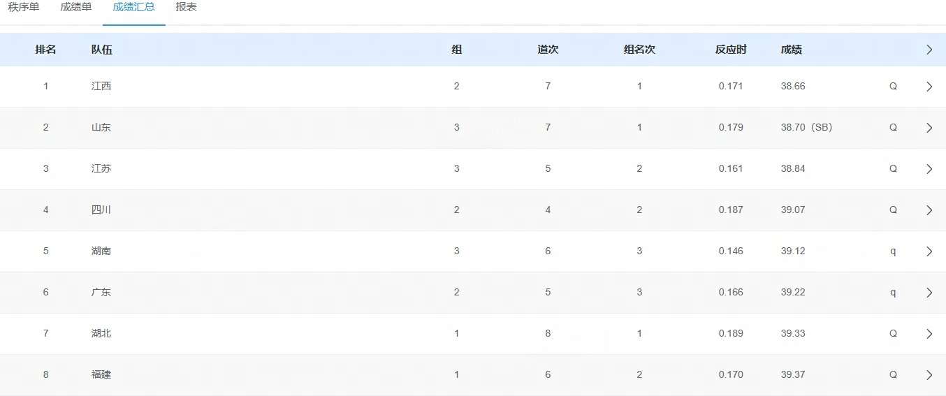 好险!差点就在赛场上看不到苏炳添了!全运会男子4x100米接力预赛,广东队位列第二组,派出陈嘉浩、刘洪熙、丘智贤和严海滨出战,以39秒22位列小组第三,而小组前两名直接晋级。最终,广东队的成绩在所有没能直接入围决赛的队伍中排在第2位,压线获得了递补晋级决赛的资格。