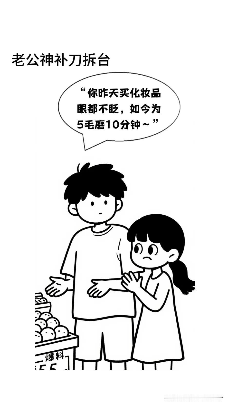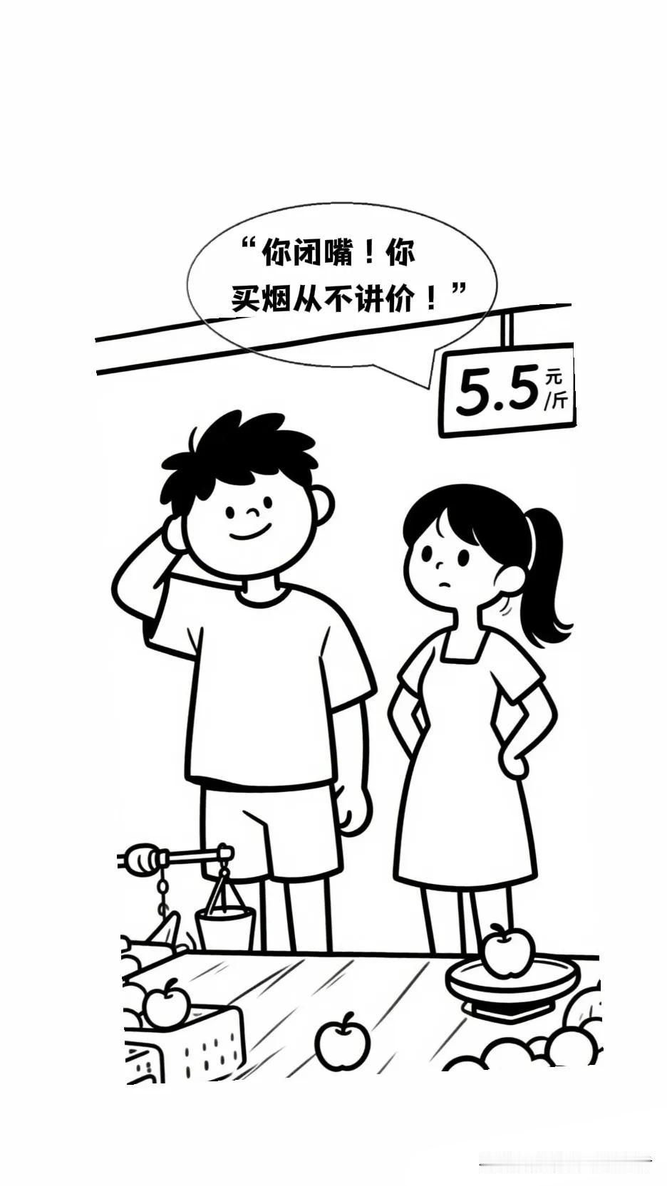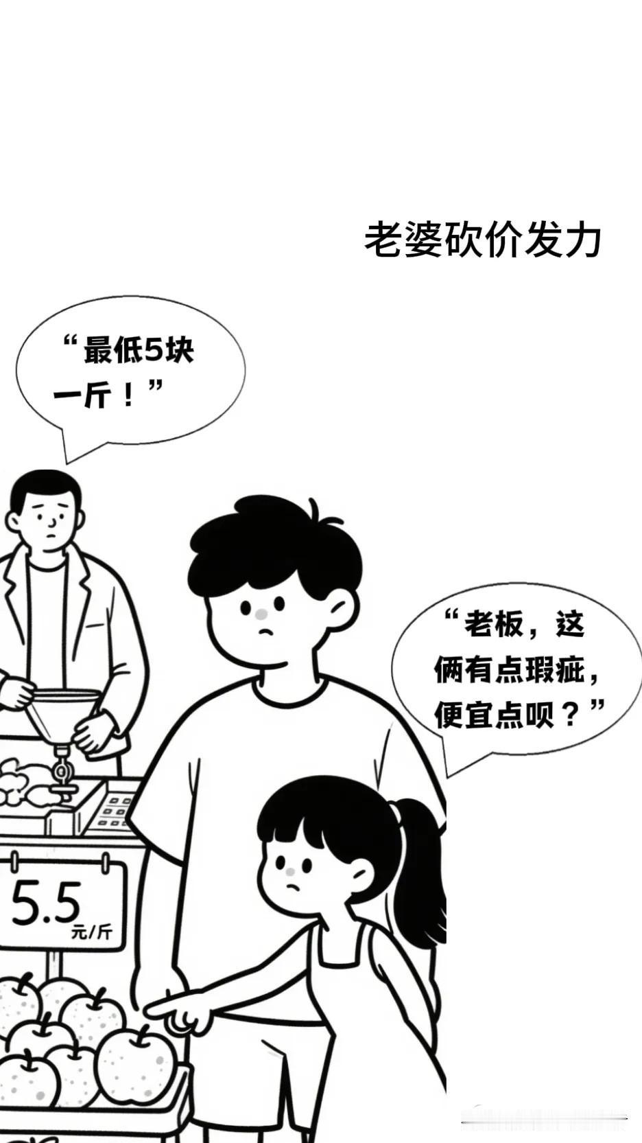 趣味漫画:老婆对着摊主:“老板,这苹果能不能便宜点?你看这俩有点小瑕疵。”摊主:“算你5块一斤,最低了。”老公突然插话……