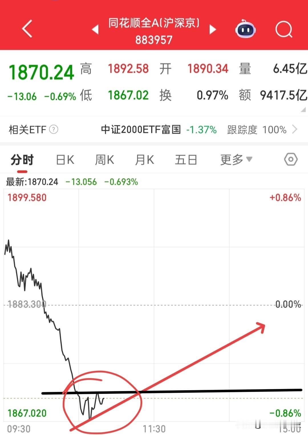 是不是很好奇为什么大跌我敢让你们拿货,上午说完它就开始拉升了,上涨家数也从1200家涨到了2200家! 你看全A,我昨天好像给你们说过了,它的支撑位1871点,跌破支撑之后,开始走旗行结构,低点一直在抬高,所以他就是企稳了!就这么简单! 其实最主要的还是情绪,龙头出笼,不跌停,反而往涨停板冲击,那对短线生态来说,是有助推的作用的,情绪起来,一切都会好起来! 所以预判必须要情绪、技术相结合才能更好的判断出来,龙头不死,情绪不止! 明天大概还能玩一天,中期不看好股市,只能寻找热点去做短线,大盘大概就是震荡式下跌了! 我既然这么说,你就要做好准备,大盘这次反弹不放量突破前高,就形成头肩顶了,调整幅度就很哇塞了