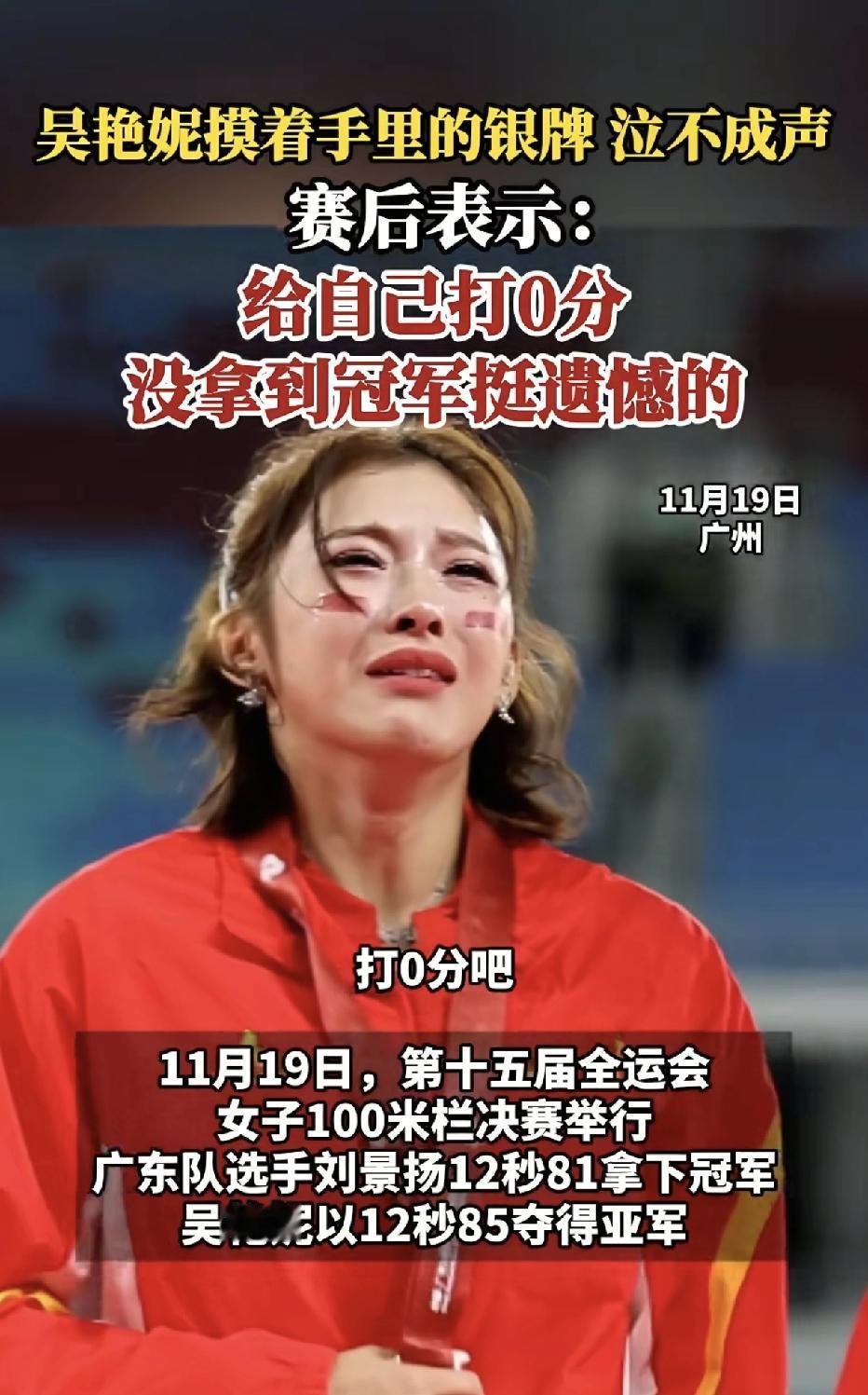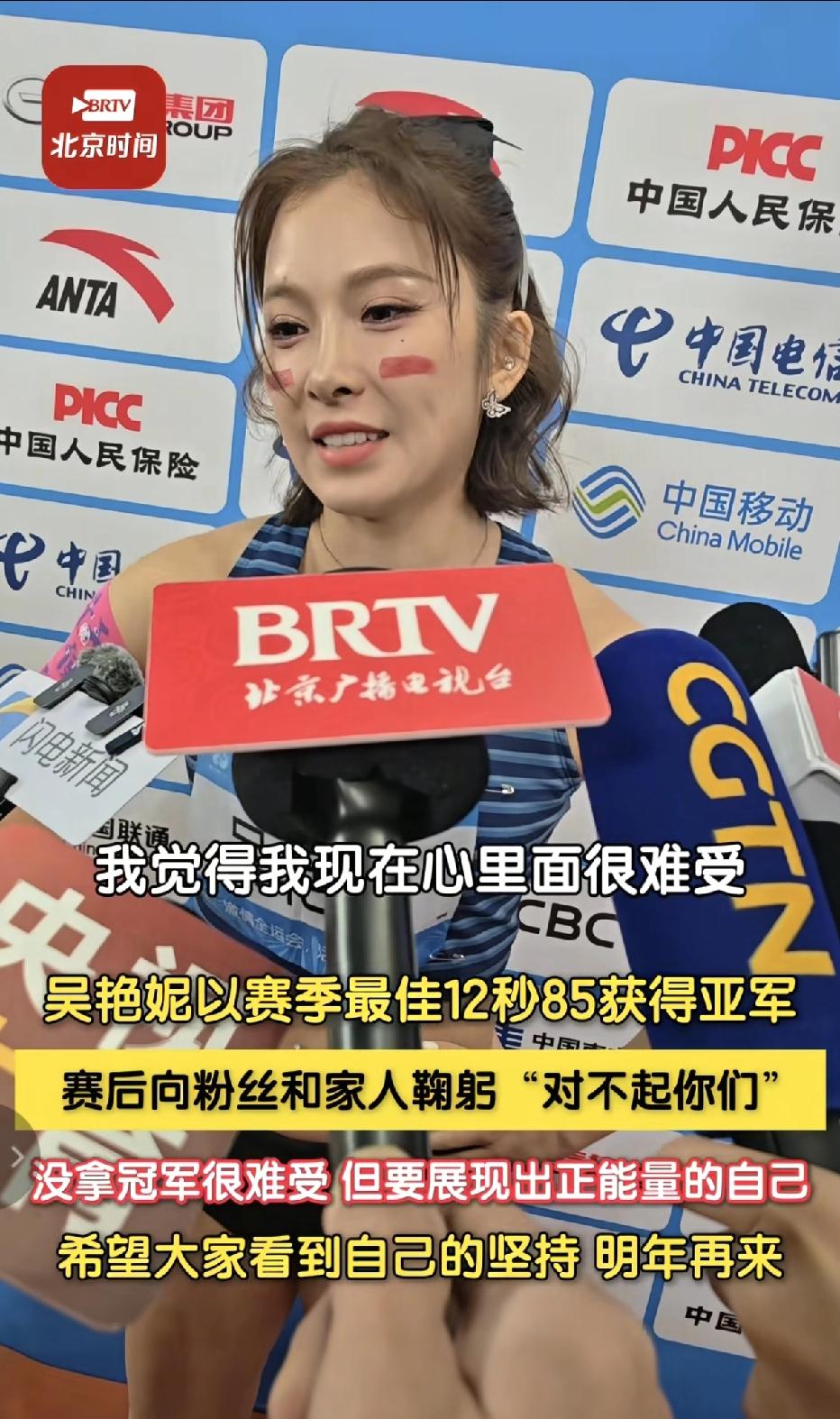 吴艳妮以赛季最佳12秒85获得亚军,赛后向粉丝和家人鞠躬“对不起你们” ,没拿冠军很难受,但要展现出正能量的自己,吴艳妮,不要难过,你已经很棒啦,下个赛场见!