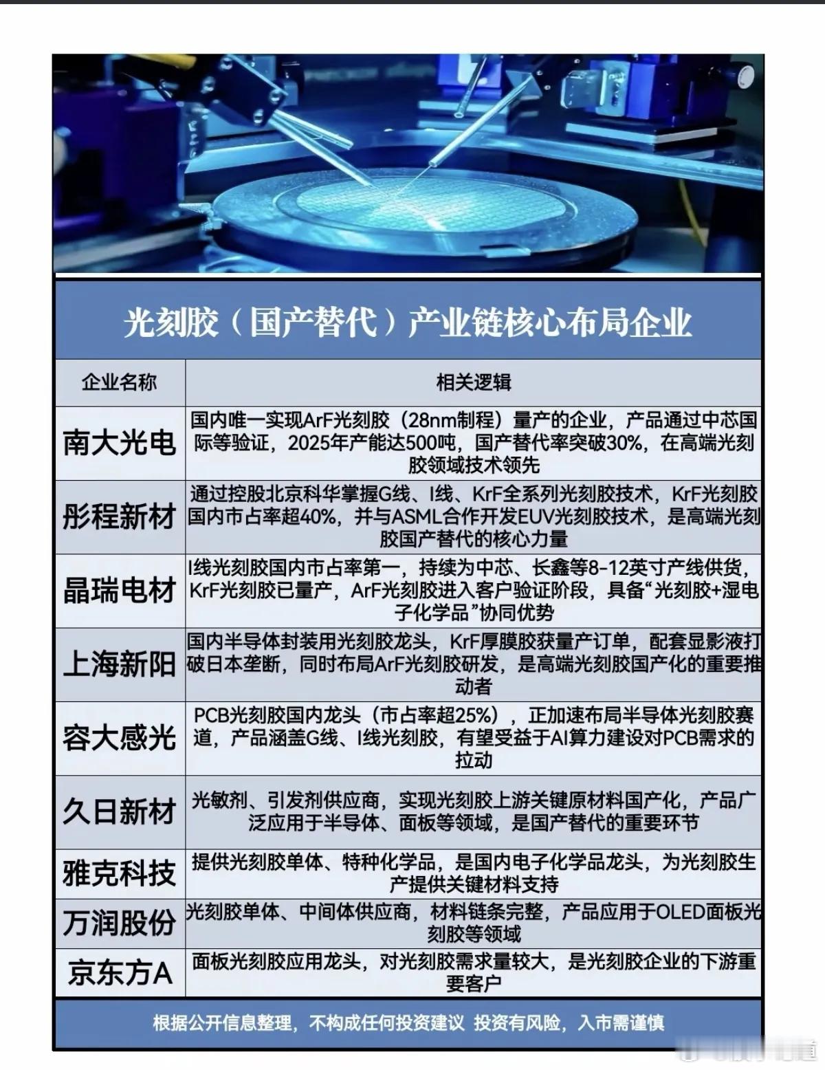 光刻胶(国产替代):产业链核心龙头!对日反制,光刻胶供应可能会受到影响,国产替代雄起。相关核心龙头股: