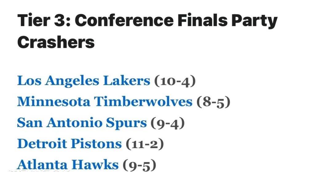 ESPN为联盟各队目前实力分档: 第一档,雷霆 第二档,掘金,火箭,尼克斯,骑士 第三档,湖人,森林狼,马刺,活塞,老鹰 第四档,勇士,快船,魔术