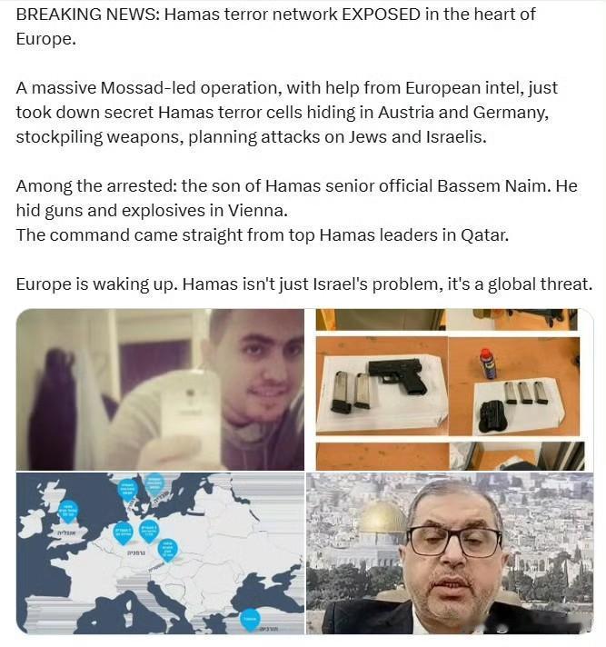 哈马斯恐怖网络在欧洲腹地被曝光。 一项由摩萨德主导、并在欧洲情报部门协助下开展的大规模行动,刚刚捣毁了隐藏在奥地利和德国的秘密哈马斯恐怖小组,这些小组囤积武器,策划针对犹太人和以色列人的袭击。 被捕者当中包括:哈马斯高层官员巴塞姆·奈姆的儿子。他在维也纳藏匿了枪支和炸药。相关指令直接来自驻卡塔尔的哈马斯高层领导。 哈马斯不仅是以色列的问题,它是全球性的威胁。