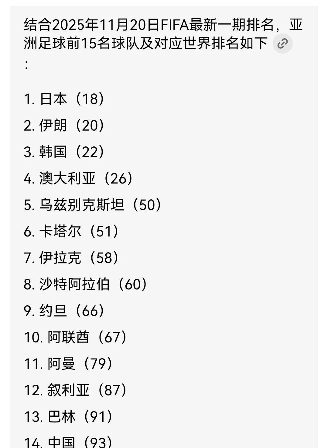中国国足4个月不打热身赛对积分和排名反而是好事,国足世界排名依然不变,目前位列世界第93位,亚洲第14位,国足在2025年错过了9月、10月、11月这三个国际比赛日窗口期的6场热身赛机会,如果打了比赛,国足大概率输多胜少,积分肯定要变少,排名肯定还会下滑,现在好了,没打比赛积分也不变。 亚洲有多支足球队因为比赛表现不佳,反而导致世界排名下降,乌兹别克斯坦由于近期赛事中表现不佳,世界排名直接下降5位,最新位列世界第50、亚洲第5名;伊拉克也是海湾杯和世预赛表现不好,世界排名下滑至第58位、亚洲第8位;卡塔尔也是世界排名下滑7位至第55位;印度队因近期对阵新加坡等队的赛事表现低迷,世界排名下降3位至第136位,创下2016年以来的最低排名,在亚洲位列第25位;印尼队由于世预赛附加赛2连败,接连不敌沙特和伊拉克,丢掉13.21分,世界排名下降3位跌至第122位,亚洲排名23位;约旦排名下降4位,世界排名来到第66位;巴林的世界排名下降2位,最终位列第91位,亚洲13位;阿曼世界排名下降1位,保持在第79位;伊朗和澳大利亚世界排名也下降。 只有日本队较上期提升1位至世界第18位,日本11月热身赛中先后击败加纳和玻利维亚;韩国队则维持世界第22位的排名不变。 中国国足没有主帅4个月,反而对排名是大大的利好,比赛一场没有打,积分也就自然不变了,2025年4月中国国足世界排名94位,到现在中国国足世界排名93位,今年反而还上涨了1位,中国国足真的很稳定啊!