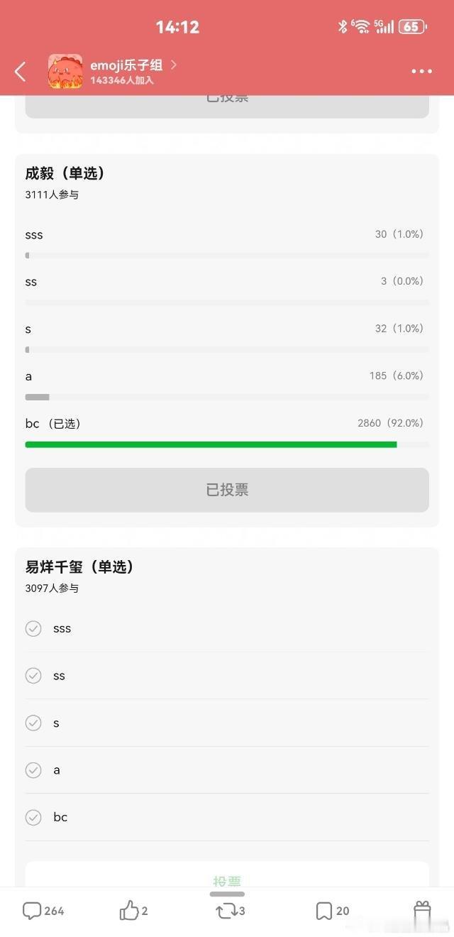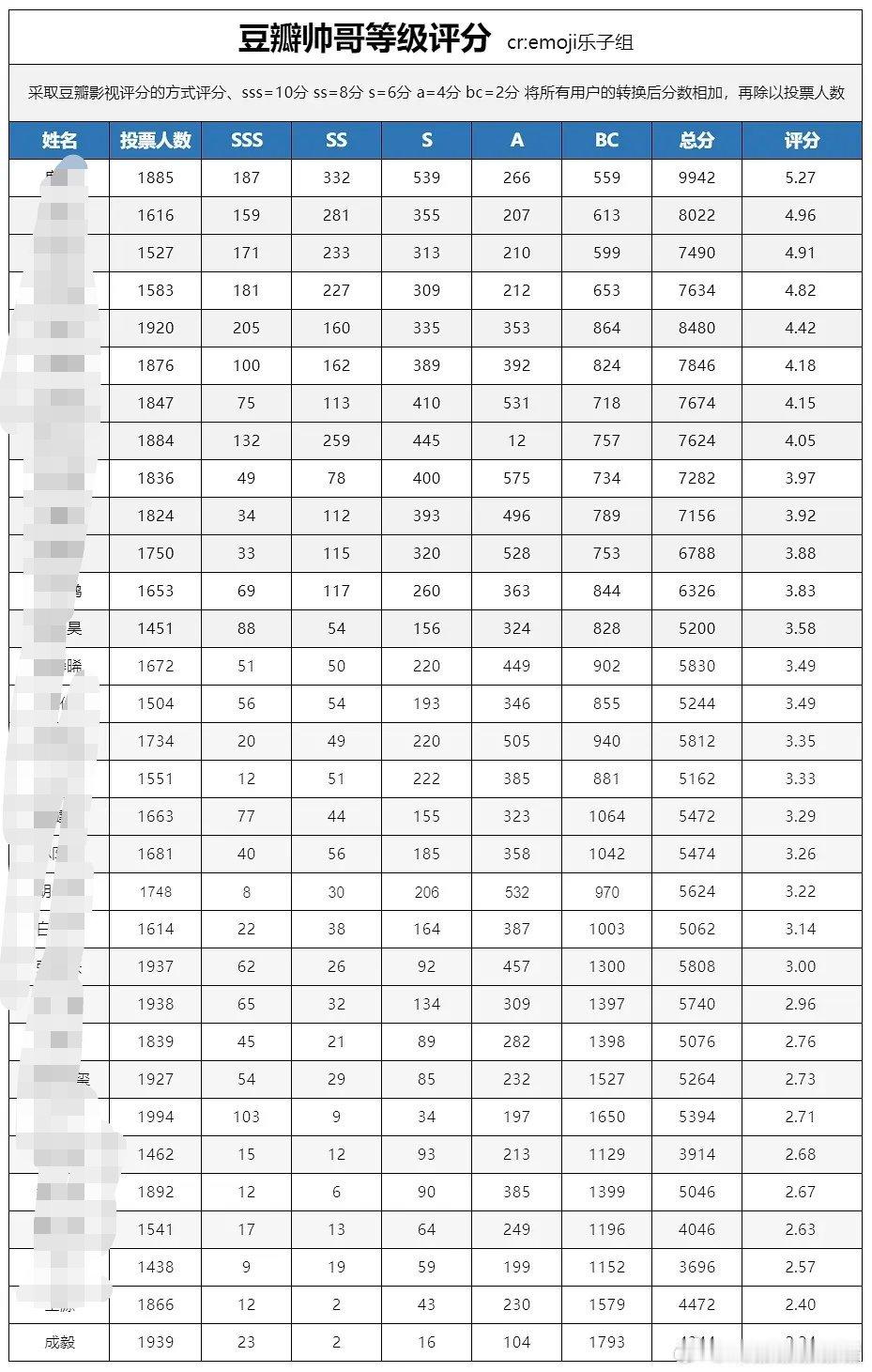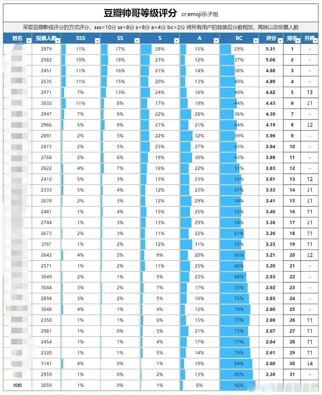 豆瓣酱搞男演员选美比赛,sss=10分(最高分),bc=2分(最低分),老e目前垫底,92%的人给他打了最低分。