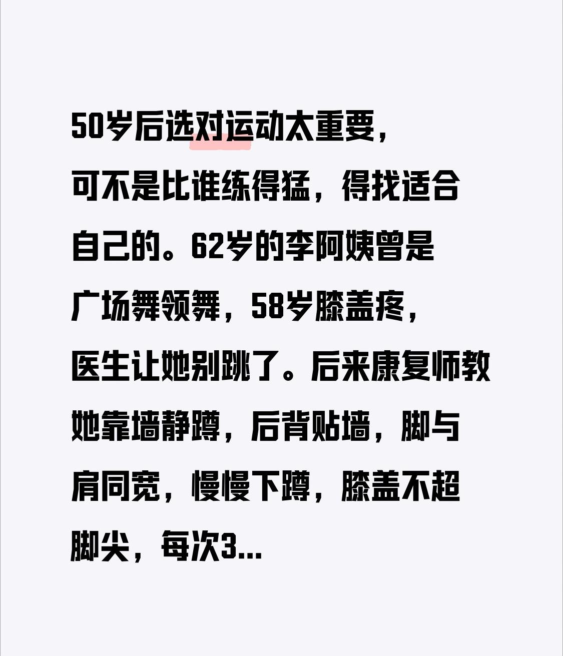 50岁后选对运动太重要,可不是比谁练得猛,得找适合自己的。62岁的李阿姨曾是广场舞领舞,58岁膝盖疼,医生让她别跳了。后来康复师教她靠墙静蹲,后背贴墙,脚与肩同宽,慢慢下蹲,膝盖不超脚尖,每次30秒,每天5组。开始她蹲10秒就腿抖,现在能蹲2分钟,半年后膝盖不疼,爬5楼都轻松。她还养成散步晒太阳的习惯,早上9点在小区花园走20分钟。医生说晒太阳补维D对骨头好,她现在膝盖舒服,睡眠也好50岁身体