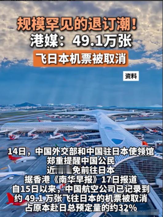 49.1万张飞日本机票被取消。看到没有?取消了49.1万张飞日本的,才32%!还有68%,也就是还有95.1万张机票还没取消呢。这里面有不少人会觉得,越少人去越舒服,别人不去不关我事的态度! 最近的数据实在有点意思,49.1万张飞往日本的机票被按下了退票键,这波操作直接带走了预订总量的32%,但依然有95.1万张机票躺在很多人的行程夹里,“沉默的大多数”依然选择按兵不动。 这95.1万人之所以还在犹豫或者坚持,绝大多数是因为“账”太难算了,11月14日发出的那两份分量极重的提醒,绝不是无的放矢,看看对面这阵子的动静:针对我们国家公民的治安案件频发,甚至有些恶性袭击到现在还没个说法,再加上那种所谓“AI诈骗”的新型陷阱,安全隐患早就不再是理论上的概率问题了。 更深层的原因在于一种氛围的变质,近期某些政客在涉台问题上的错误言论,甚至可以说是粗暴干涉,直接导致了当地民间情绪的某种对立,这不是单纯的旅游话题,而是当右翼言论抬头时,每个走在街头的普通游客都可能成为那股莫名敌意的承载者,航空公司迅速推出的“免手续费退票”政策,与其说是商业让利,不如看作是对这种潜在风险的一种官方盖章认证。 而从11月16日开始,受影响航班的比例一度飙升到了82.14%,这种看似“温和”的民间自发退票潮,实际上是一种非常有力量的表态,有航空分析师直言,这点退票量对中国庞大的国内航空网络来说,只不过是毛毛雨,伤不着筋骨。 但这对彼岸的打击可就是另一码事了,要知道仅仅在2025年的头9个月,我们过去捧场的游客就甩出了将近7万亿日元的真金白银,撑起了当地国际旅游收入的四成江山,连穆迪分析都不得不出来说实话,如果中国客流持续“断崖”,这冲击力是显著的,这哪是什么“别人不去我更清静”的捡漏时刻?在某些时候,个人的消费行为不可避免地会被卷入大国博弈的浪潮中,你想“切割”,但经济账本把这种联系绑得死死的。 我们尊重的不仅仅是那49.1万人果断退票的“血性”,也试图理解那95.1万人进退两难的“无奈”,但自由永远是建立在对风险清晰认知的基础上的,国家给出的预警,其实是把风险这一课前置了,这不仅是为了保护大家的钱包,更是为了保护大家的周全。 这几十万张还没退的票,每一张背后都是具体的悲欢与成本,这无需苛责,但在当下这个微妙且复杂的节点,当“说走就走的旅行”遇上了不可控的外部环境,当个人利益与某些更宏大的背景产生摩擦时,也许我们需要的不仅仅是计算“性价比”,更要学会在风险与收益之间,重新校准那把衡量安全的尺子。