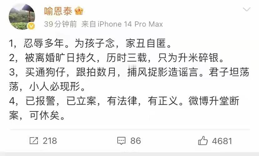 喻恩泰确认自己做了王宝强,被妻子史林子带了绿帽。 他说自己为了孩子,忍气吞声多年,但是对方不知悔改,一而再,再二三地出轨多人。 现在对方为了多分财产,买通狗仔偷拍跟踪他数月,他已经报警了。 他给所有男人上了一课,娶媳妇可以娶丑的,矮的,千万不要娶一个不安分守己的。