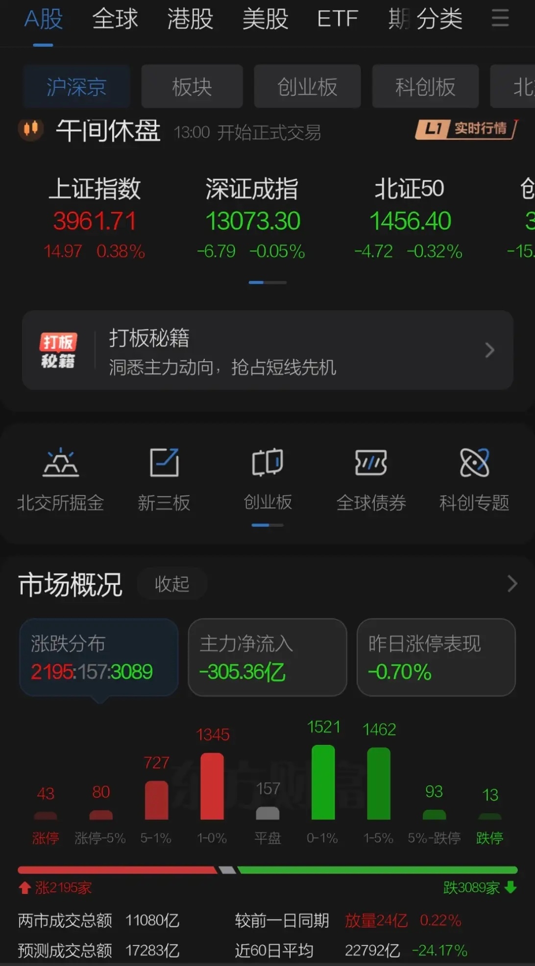 周四A股迎来必须转机日,连续普跌四天后今日能否涨多跌少成为情绪风向关键!早盘日韩股市大举高开隔夜美股回升英伟达大涨,业绩后夜盘大涨CPO高开,碳酸锂期货再度大涨新能源冲高,券商有中金利好纷纷高开,但随后银行三桶油三大运营商撑盘再度拉崩市场,成交无明显放大的情况下四大行大涨直接打击情绪,上午一度四千家个股下跌,昨日各路投资公司已经给出牛市结束提示,若近期没有转机存量最多资金要发生溃退,十一点左右地产股福建海南低价低位方向反弹,指数顺势回升算是出现点转机,此处年度炒作不断篇可继续等待情绪回升。上午下跌家数仍在3000家下午需要再接再厉,同时港股表现弱势小米集团携互联网继续下跌短期需等A股转机出现,期权方面同步弱势双卖操作强势,预计指数在关键位置保持弱势震荡会有个股板块出来活跃市场,近期股指期货和期权交割,解冻资金明日可使用今日有抢跑预期,如在关键位置挺住后市或有再度活跃机会,建议等待时间转机和情绪恢复。