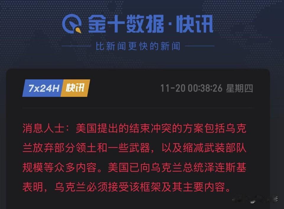 美美国提出的结束冲突的方案包括乌克兰放弃部分领土和一些武器,以及缩减武装部队规模等众多内容。美国已向乌克兰总统泽连斯基表明,乌克兰必须接受该框架及其主要内容。 都到这种份上了,俄军会停下? 大概率会把撤销制裁加入和平方案之中并且为核心议题。不同意不停下。再过十年,一部欧洲的《第一滴血》里欧洲兰博大叫:我能打赢,是他们不让我打了[笑哭][允悲]乌克兰冲突 俄美乌停火谈判 美国乌克兰协议 西方乌克兰联盟