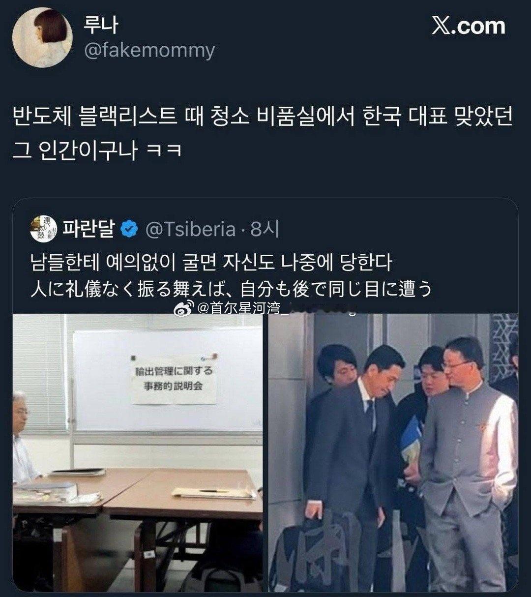 看着日本外交官访华的画面。 不少韩国网民想起来,19年韩日半导体断供风波的时候,趾高气昂拒绝和韩方代表握手,然后把韩方官员带往杂物间开会的日方代表团成员之一,就是如今访华的金井。 韩国网民对此表示,真的是风水轮流转。