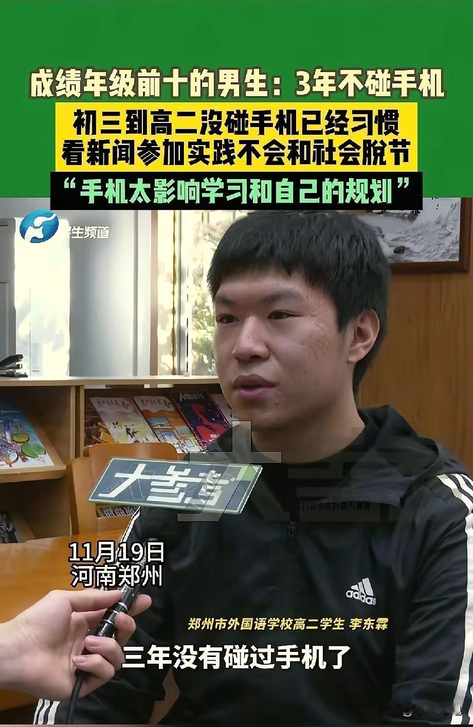 河南,一位高二男生火了!不是因为帅气的外表,也不是因为惊艳的才艺,而是他居然3年不碰手机,把成绩冲了年级前十,成了全网羡慕的自律学霸! 这名男生叫李东霖,是郑州外国语学校的高二学生。从初三到高二,他整整三年没碰过手机。他说“手机太影响学习和自己的规划”,干脆直接戒了。 没手机的他,靠看新闻、参加实践保持对社会的认知,没和外界脱节。把别人刷手机的时间用来学习,成绩冲到年级前十,这自律性绝了。 这事在网上吵翻了。有人夸他厉害,现在年轻人能忍住不碰手机的太少了;也有人质疑,信息时代完全不用手机,会不会错过很多学习资源,比如在线课程、学习APP这些。 其实这事儿得客观看。对于自控力弱的学生,手机确实容易分心,像李东霖这样干脆不用,是个狠招,也确实出了效果。但对于能合理利用手机的学生,它也可以是学习工具,查资料、学网课都很方便。 现在很多学生被手机耽误了学业,家长头疼得很。但也有学生把手机当助力,成绩反而更好。所以关键还是看个人能不能管住自己。 李东霖的做法不一定适合所有人,但他的自律和对自己人生的规划能力,值得点赞。在手机不离手的时代,能主动给自己设限,专注于更重要的事,这股劲儿很难得。 各位读者你们怎么看?欢迎在评论区讨论。
