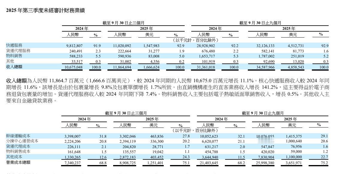 中通快递2025Q3营收119亿元,净利润25亿元 收入为118.647亿元,同比增长11.1%。 净利润为25.387亿元,同比增长6.7%。经营活动产生的现金流量净额为32.110亿元,同比增长3.2%。 包裹量为95.73亿件,同比增长9.8%。截至2025年9月30日,揽件/派件网点数量为31,000余个,直接网络合作伙伴数量为6,000余个,自有干线车辆数量为10,000余辆,分拣中心间干线运输路线约为3,900条,分拣中心的数量为95个,其中91个由本公司运营,4个由本公司网络合作伙伴运营。 营业成本总额为89.087亿元,同比增长21.4%。干线运输成本为33.020亿元,同比下降2.8%。分拣中心运营成本为23.941亿元,同比增长7.6%。物料销售成本为1.356亿元,同比下降16.1%。其他成本为28.722亿元,同比增长115.9%,其中服务直客客户的支出增长为人民币14.717亿元。 毛利为29.560亿元,同比下降11.4%。毛利率为24.9%,而去年同期为31.2%。 总经营费用为5.509亿元,同比增长11.8%。销售、一般和行政费用为6.326亿元,同比增长16.2%。其他经营收入净额为0.817亿元,同比增长58.3%。经营利润为24.050亿元,同比下降15.4%。经营利润率为20.3%,去年同期为26.6%。 净利润为25.387亿元,同比增长6.7%。调整后净利润为25.061亿元,同比增长5.0%。 息税折摊前收益为36.151亿元,同比下降3.1%。调整后息税折摊前收益为35.825亿元,同比下降4.2%。