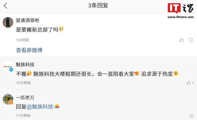 值得一提的是,有用户在该微博评论区留言询问魅族是否要搬去新总部?魅族科技官方表示:“不搬,魅族科技大楼租期还很长,会一直陪着大家,追求源于热爱。”星纪魅族集团中国区CMO万志强随后也留言了“拥抱”的表情。