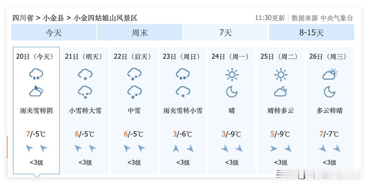 太棒了!11月21日到23日,成都川A大军最爱的川西,又要大范围下大雪啦!四姑娘山,看雪玩雪啦!虽然秋天已经结束,虽然九寨沟已经迎来旅游淡季和门票大降价……但是,下雪啦!冰雪世界的川西,也很好看啊! 冰雪世界,冰瀑的九寨沟……冬天的童话呀! 不错不错! 最近,成都,重庆,飞拉萨或者乌鲁木齐的飞机,窗外都是连绵千里的雪山,超级好看啊!太漂亮啦!太壮观啦! 很可惜,重庆主城区及周边,未来15天,可能不会下雪哦! 还是川西的雪多啊!