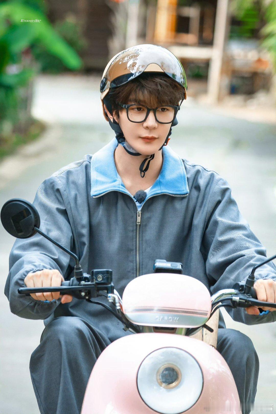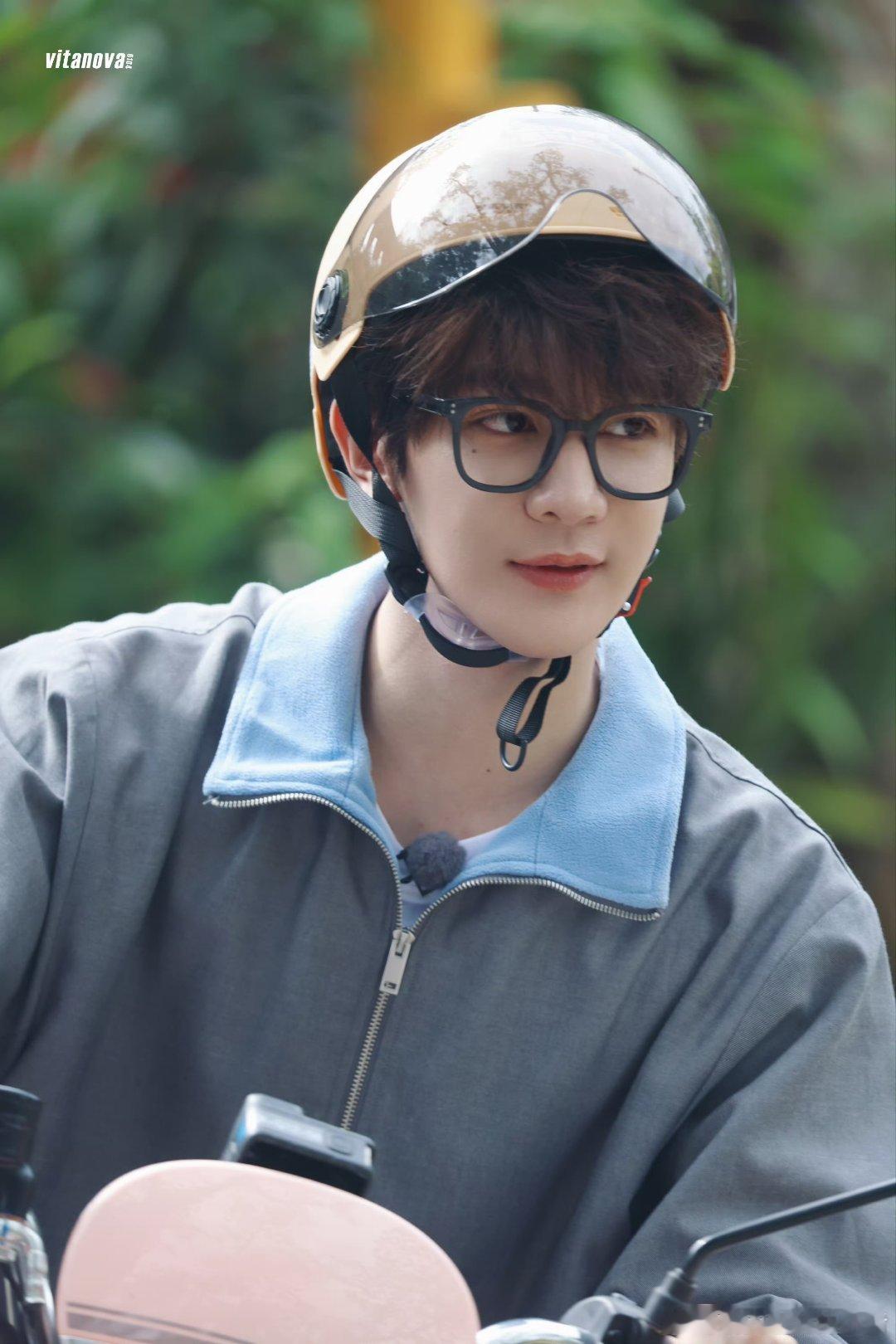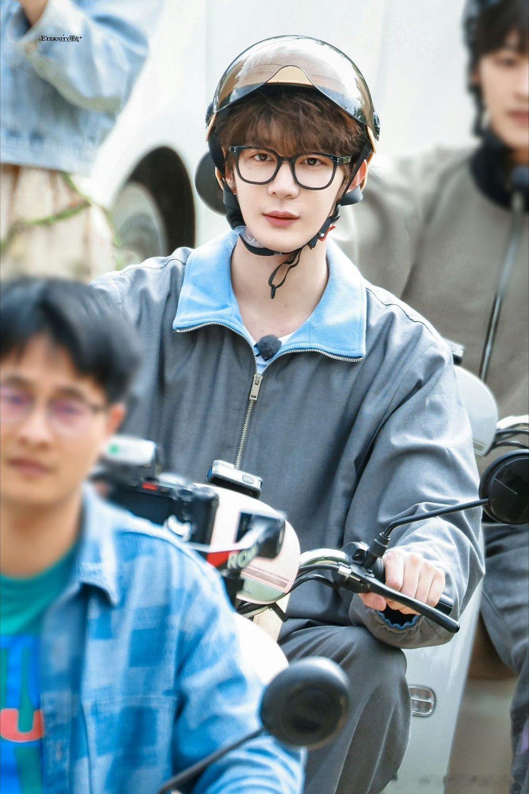 夏之光综艺录制骑车路透,这个卷发和黑框眼镜,好嫩啊