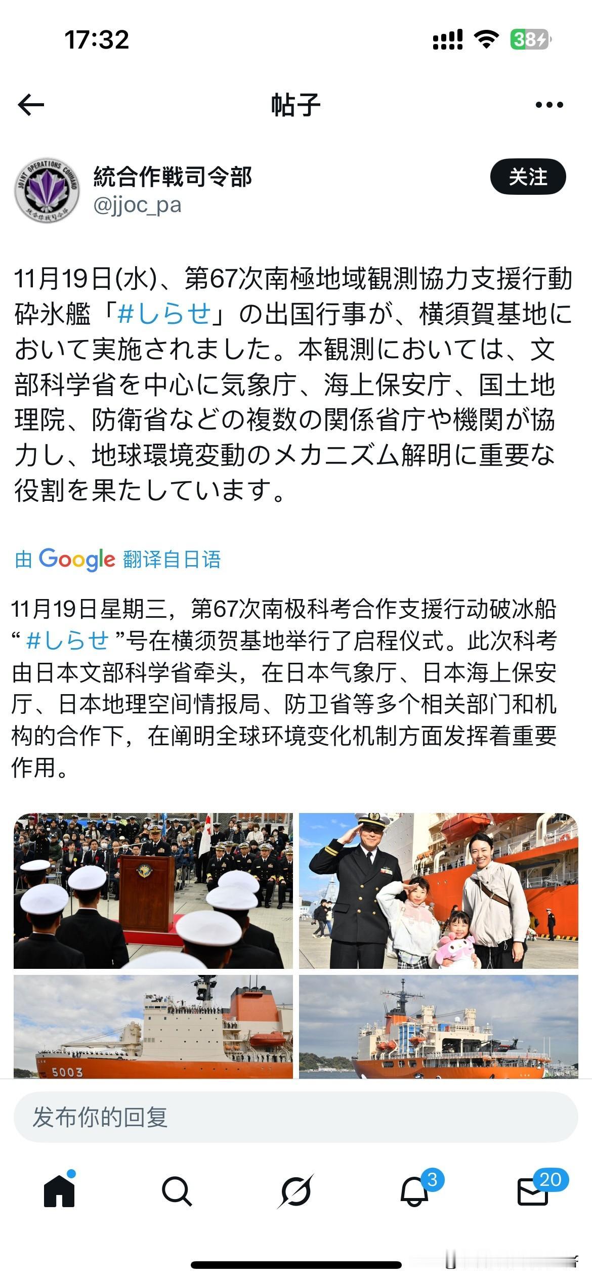 11月19日日本作战司令部官方账号发文: 第67次南极科考合作支援行动破冰船“ しらせ ”号在横须贺基地举行了启程仪式。此次科考由日本文部科学省牵头,在日本气象厅、日本海上保安厅、日本地理空间情报局、防卫省等多个相关部门和机构的合作下,在阐明全球环境变化机制方面发挥着重要作用。