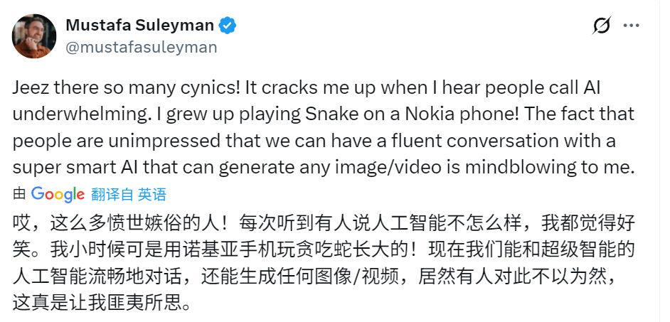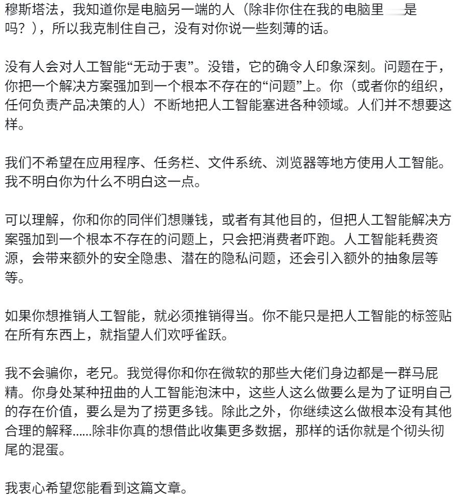 So what? 你微软CEO是卖人工智能的,当然吹得天花乱坠,你想在别人兜里掏钱,就这么简单。大部分人用不到你的大模型,因为生成这些没意义,不是所有人都面对着电脑跟一个提词器聊天。这个帖子暴漏了AI公司在军备竞赛的生存焦虑以后,算力无处释放,到处推销AI时被人嫌弃以后的埋怨。他这段话的意思是:“我们花了这么多钱做出来的神迹,你们这些愚蠢的人类怎么不买单?”现在恨不得把所有东西都贴上AI的标签,实属有些讨厌了。难道别人不以为然还是问题了,你还必须所有人都像被充值的网红一样,发布一个产品就潮吹一次?就算你大模型免费给用,我还要看有没有时间去你那破聊天框发信息,秀逗。这货这两句话让我想起了某卖电车的老板说“你们为什么还买油车”,一副嘴脸。我的钱,我想买什么就买什么,管得着么你。我的时间,我宁愿多睡会也不会去和一个智障的聊天对话框较劲。