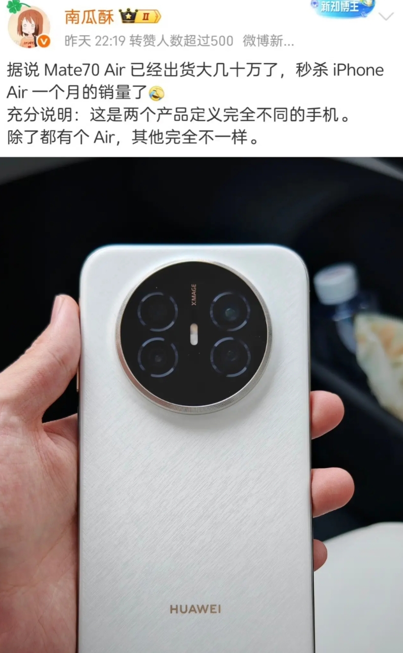 华为就是华为!这销量真的牛哇~ 原本还想着华为mate 70 air的定位挺尴尬的... 虽然薄但太宽,所以手感并不算好。 又为了兼顾影像把镜头模组做的略显突出,导致颜值方面也相对一般。 但也恰恰是这样的定位给了既想要大屏又不想过于厚重机身而且对影像也有一定需求的用户一个全新的选择~ 销量证明了华为对于市场需求的洞察程度还是挺强的!此air非彼air,华为重新定义air~