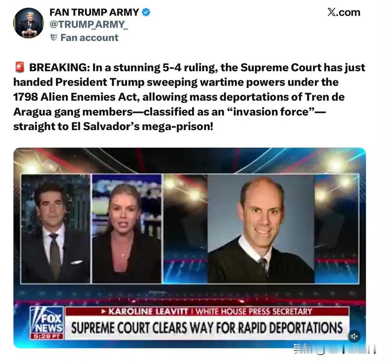 最高法院以5比4的裁決,依據1798年《敵國僑民法》賦予川普總統全面戰時權力,允許將被列為"入侵部隊"的阿拉瓜列車幫派成員大規模驅逐出境——直接遣送至薩爾瓦多超級監獄! 投下反對票的是三名自由派法官加“保守派”法官ACB。