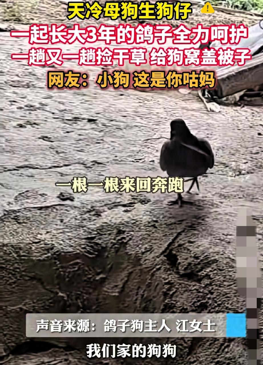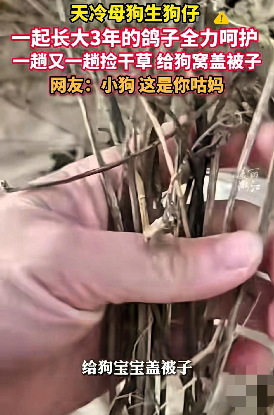 广东网友家的狗妈刚生崽,最忙的居然是一只鸽子! 这“空中邻居”简直操碎了心,一趟趟叼来干草往狗窝里铺,忙得连飞都忘了,全程小跑送货,生怕狗崽们冻着。 要我说这哪是跨界帮忙,分明是鸽子把狗子一家当成了自己人! 鸽子本就有强烈的护巢本能,会为家人精心筑窝,现在它把这份专属温柔分给了狗狗,这份情谊比啥都纯粹。 狗妈也全程淡定躺平,连一声都不凶,显然早就把这只“好鸽友”划进了自己的保护圈。 动物间的善意从不需要语言,也不分物种边界。 它们用最直白的行动告诉我们,真心相待就能打破所有隔阂。 你家宠物和其他小动物有过这样暖心的互动吗?快来评论区分享你的宝藏瞬间~