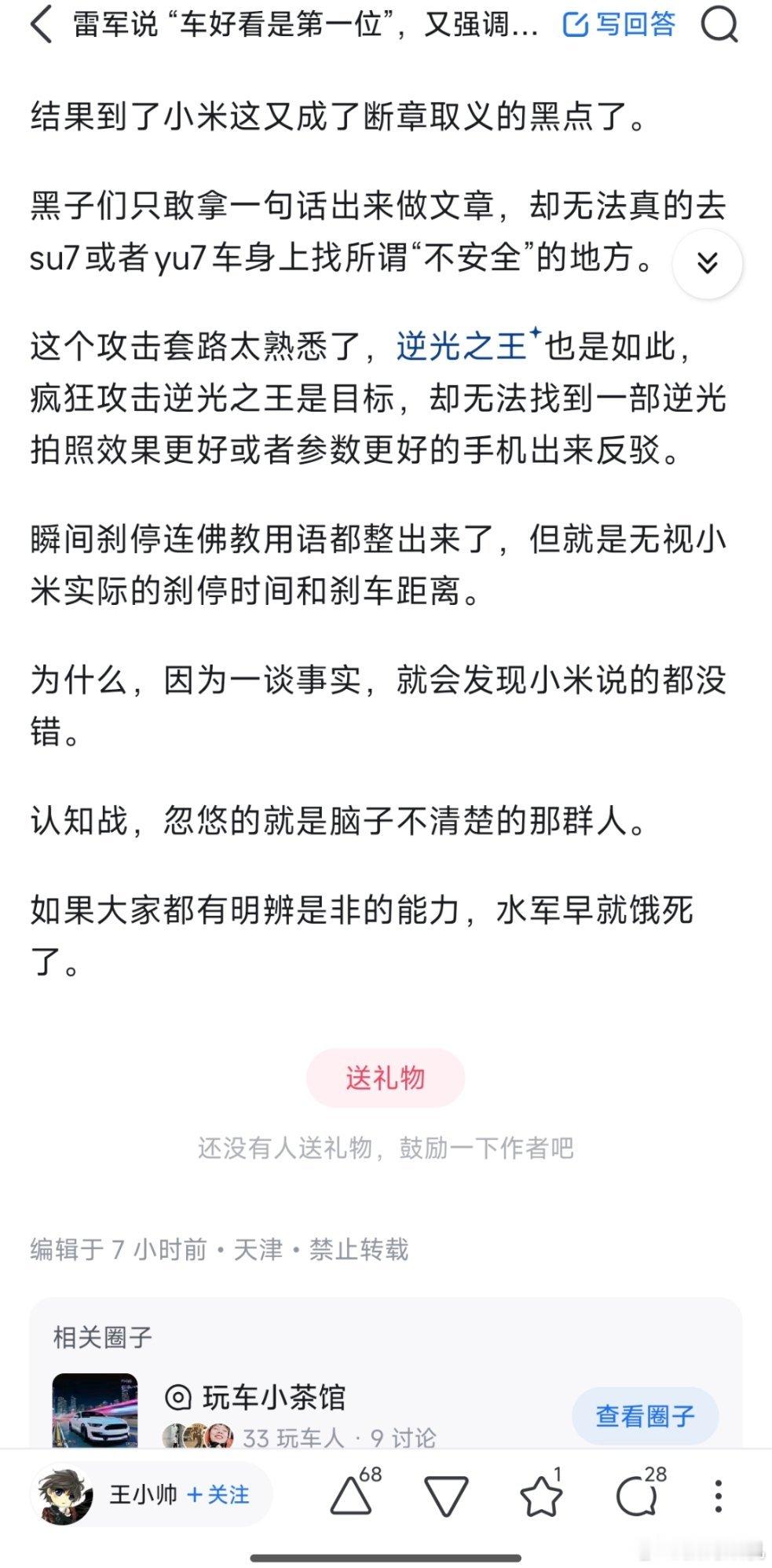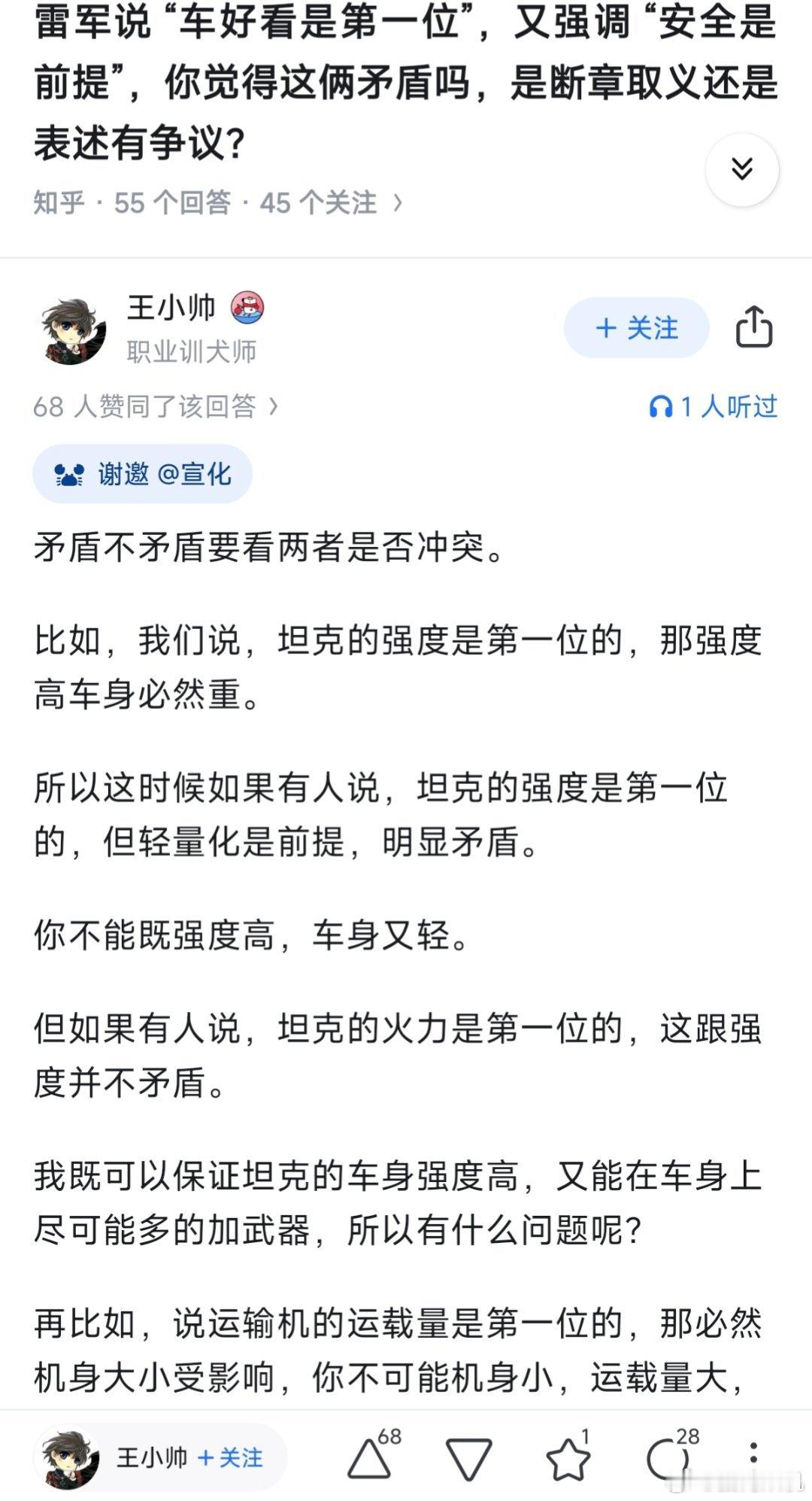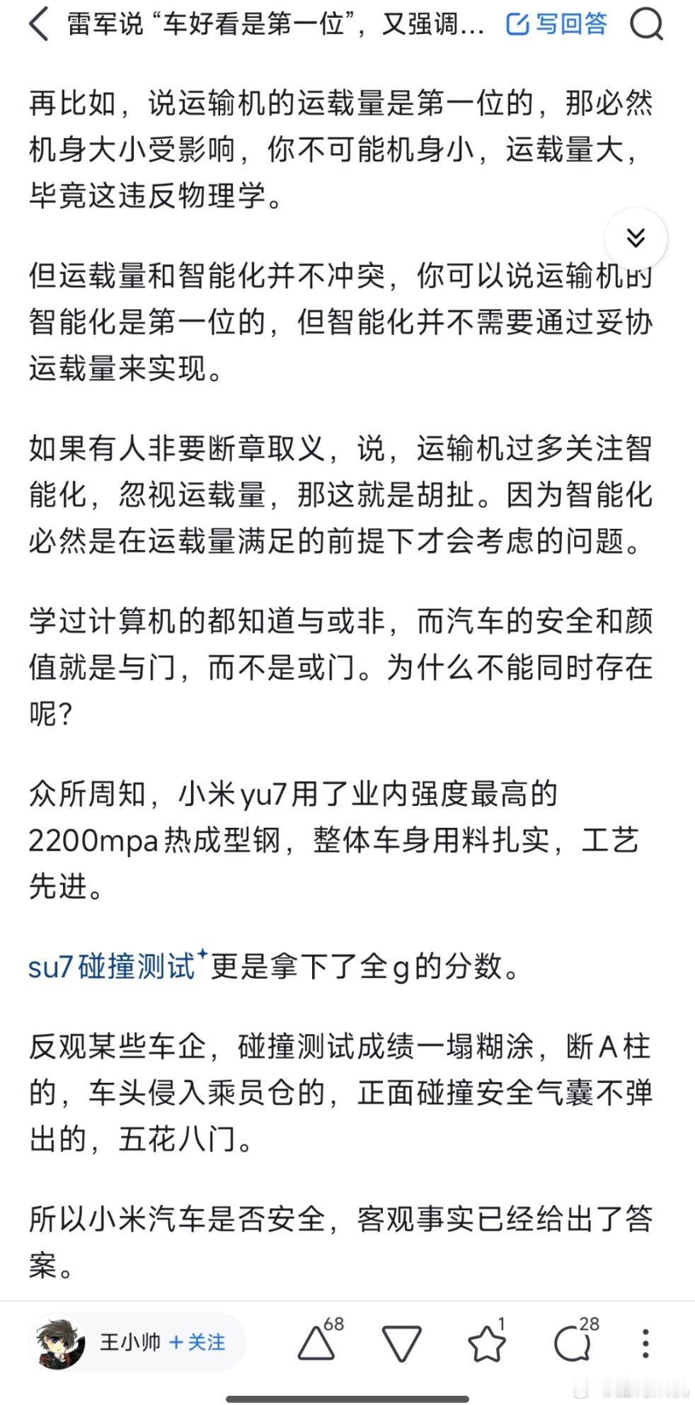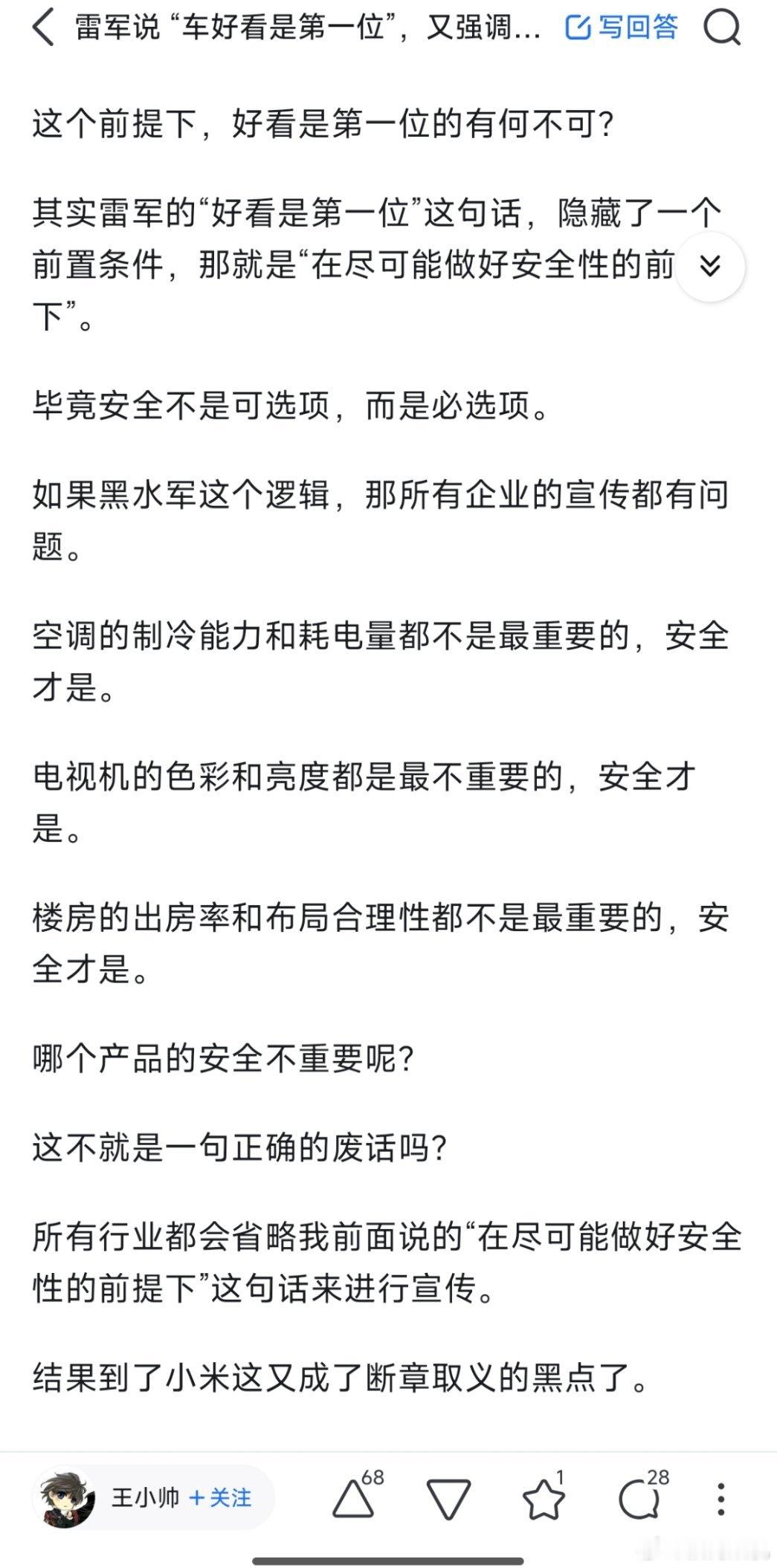 雷军说 “车好看是第一位”,又强调 “安全是前提”,你觉得这俩矛盾吗,是断章取义还是表述有争议?对于人来说,之前关于小米汽车安全的质疑,绝大多都是断章取义。